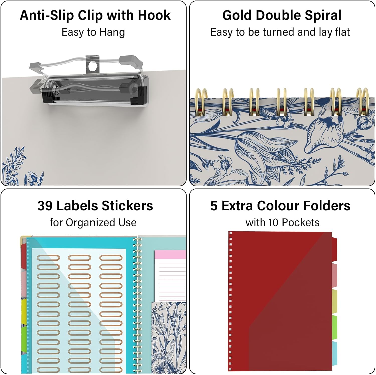 Foldable Clipboard Folio with Storage, 5 Plastic Folders with 10 Pockets,Refillable Lined Notepad (11" x 8.5"), Hardcover Project Organizer Nursing Teacher School Essentials(Blue Florals)