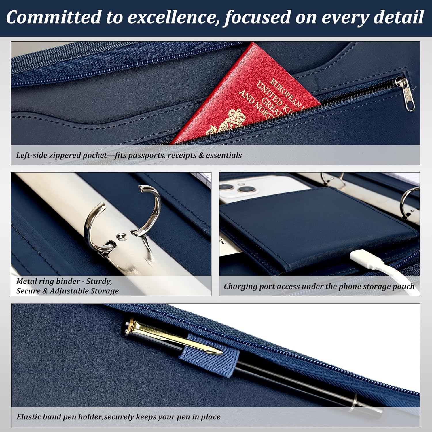 Leathario Portfolio Binder, Includes 5 Folder Index Dividers and 3 Notepads, 3-Ring Folder Organizer, Padfolio with Zipper, Vegan Leather Tablet Sleeve, Business Office Conference Clipboards