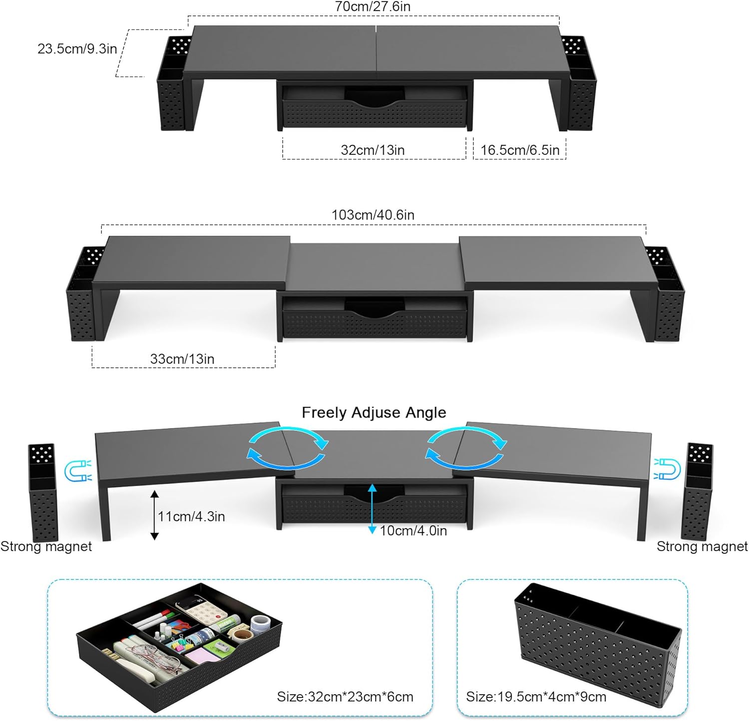 - Dual-screen office efficiency improvement: This desktop organizer is equipped with a dual-display stand, which can place two monitors at the same time, effectively expanding the workspace. It also has adjustable length (27.6-40.6 inches) and angle to provide you with a better viewing experience.