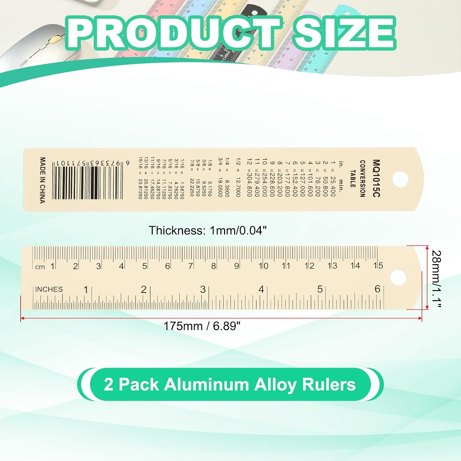 - Advantage: Made of quality aluminum alloy material, ensuring durability, rust resistance, and long-lasting use; Convenient design with rounded and smooth edges, hanging hole for easy storage, and compact size for portability. Laser etched and black anodized scales for bold, and never-fading markings; Double-sided markers with both inch and centimeter graduations, including a conversion table.