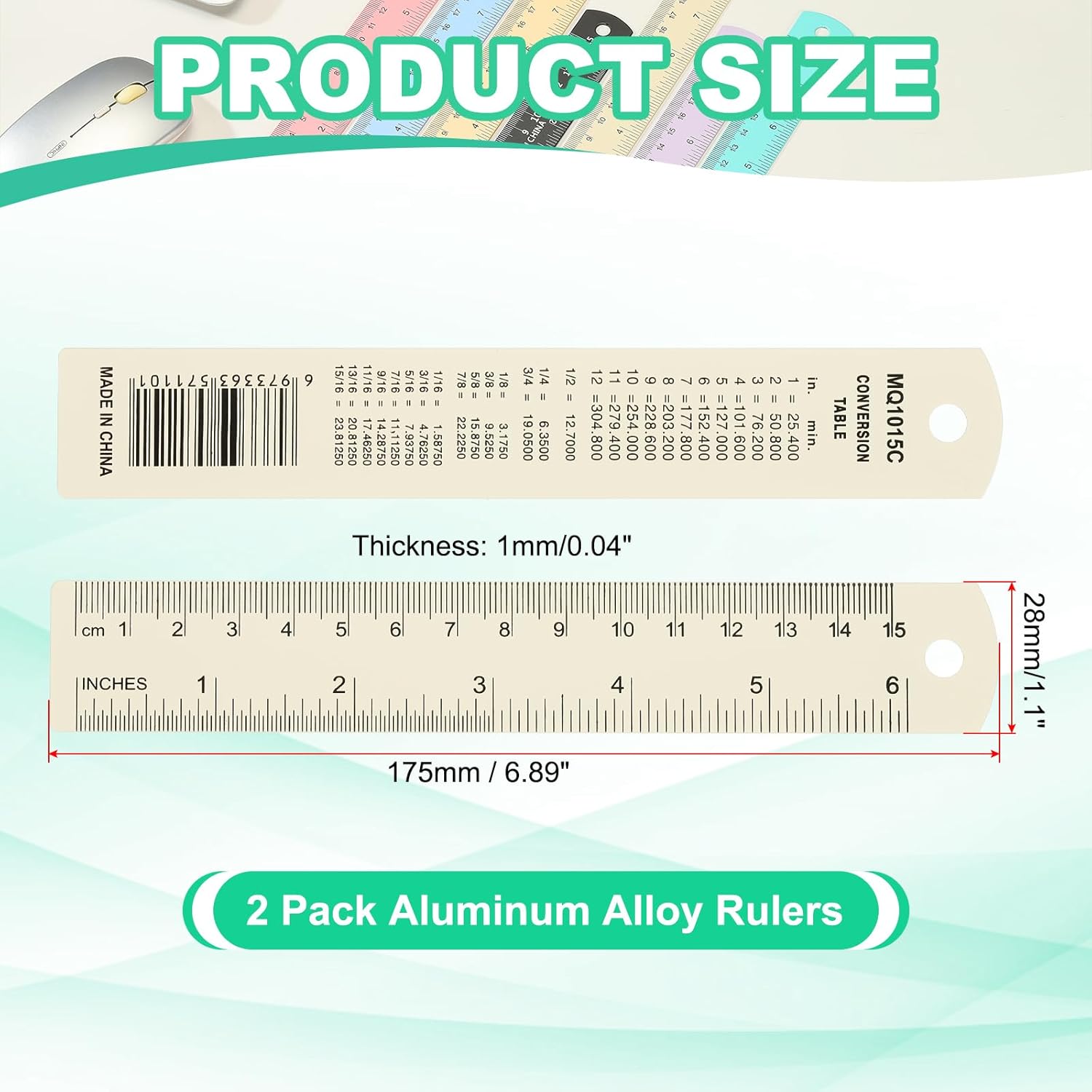 - Specification: Color: Beige; Material: Aluminum Alloy; Mileage: 15cm/6"; Total Length: 175mm / 6.89 inch; Width*Thickness: 28 x 1mm / 1.1 x 0.04 inch; Packing List: 2 Pack x Aluminum Alloy Rulers