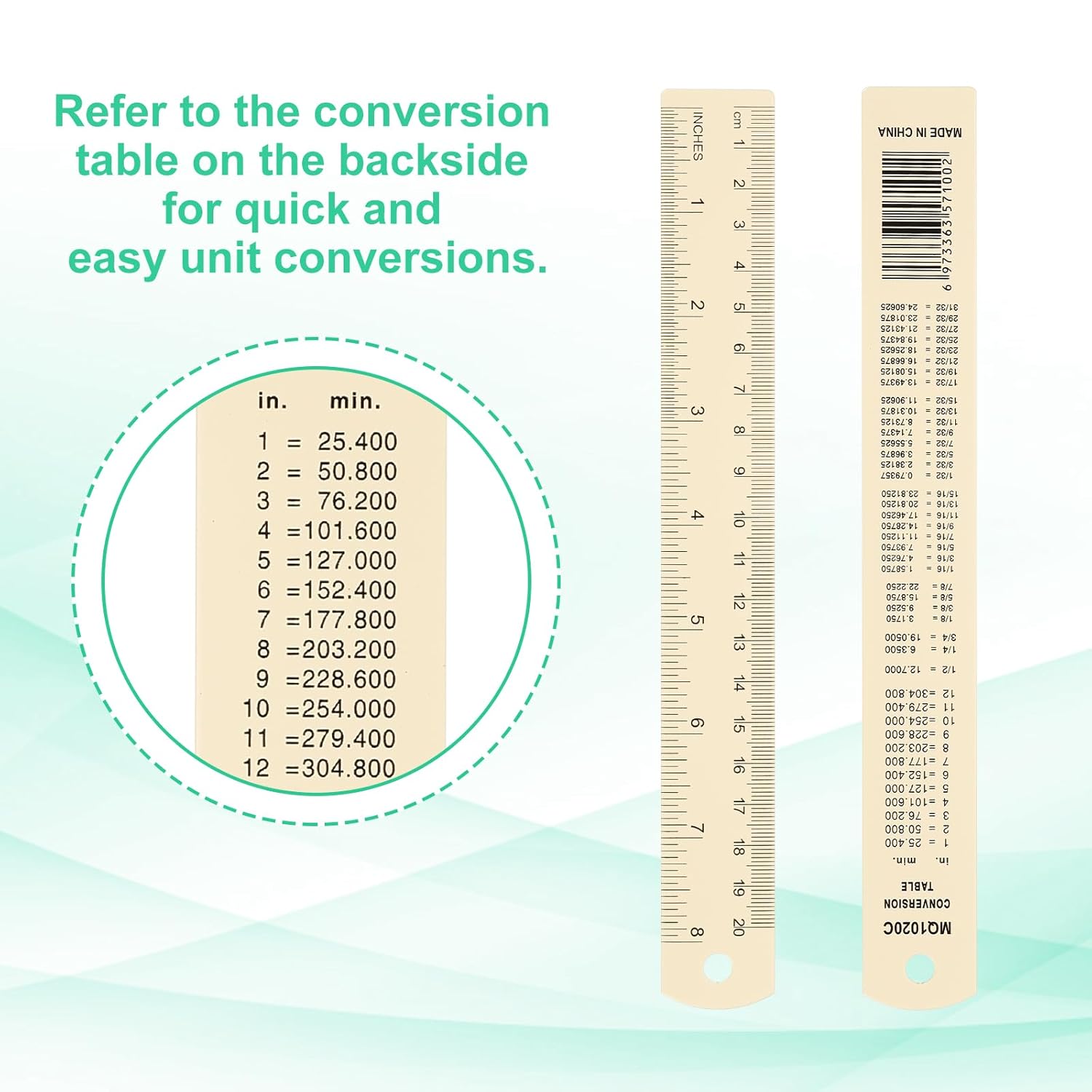 - Instruction: Use the ruler for precise measurements and calculations in both inches and centimeters. Refer to the conversion table on the backside for quick and easy unit conversion. Hang the ruler using the provided hole for convenient storage and accessibility.