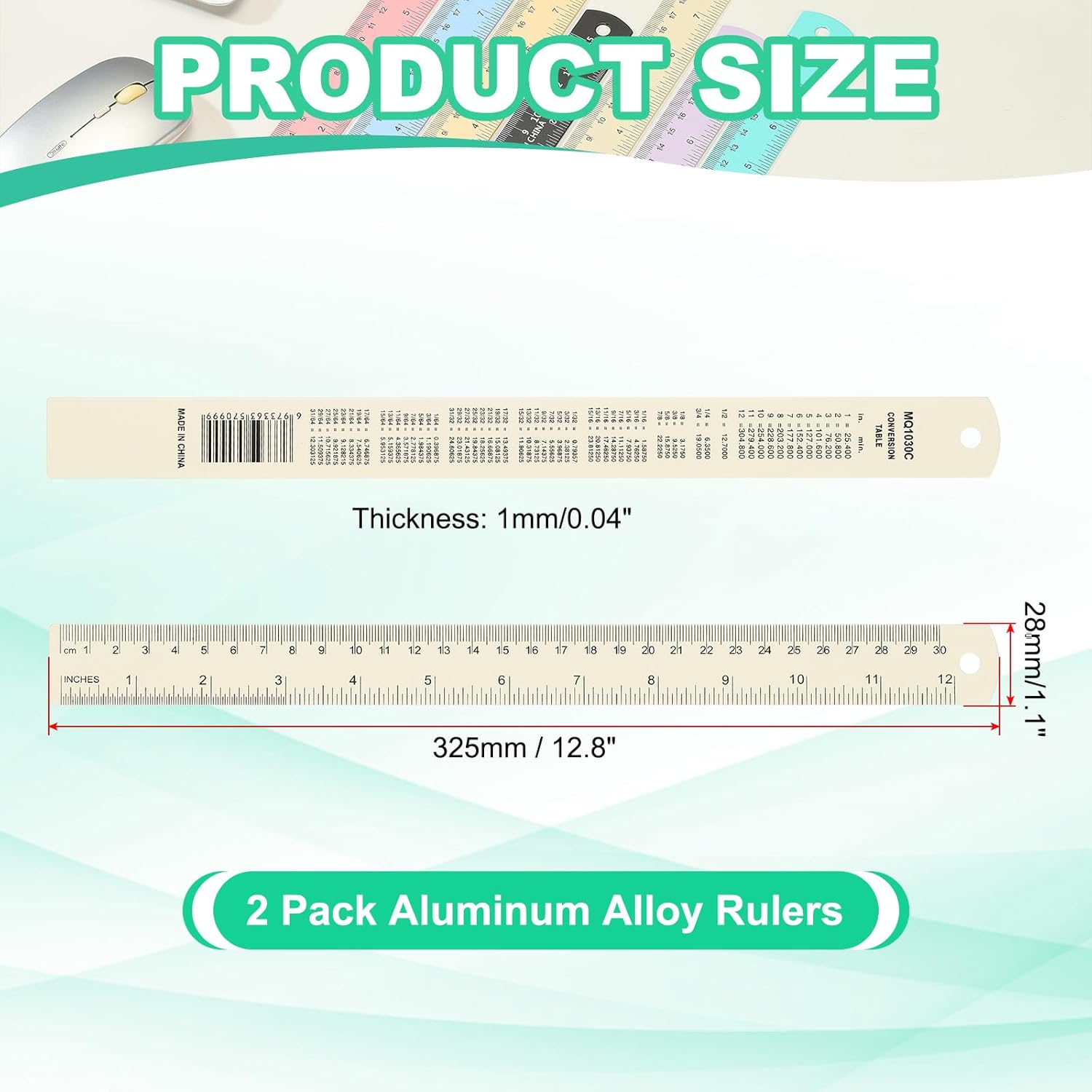- Specification: Color: Beige; Material: Aluminum Alloy; Mileage: 30cm/12"; Total Length: 325mm / 12.8 inch; Width*Thickness: 28 x 1mm / 1.1 x 0.04 inch; Packing List: 2 Pack x Aluminum Alloy Rulers