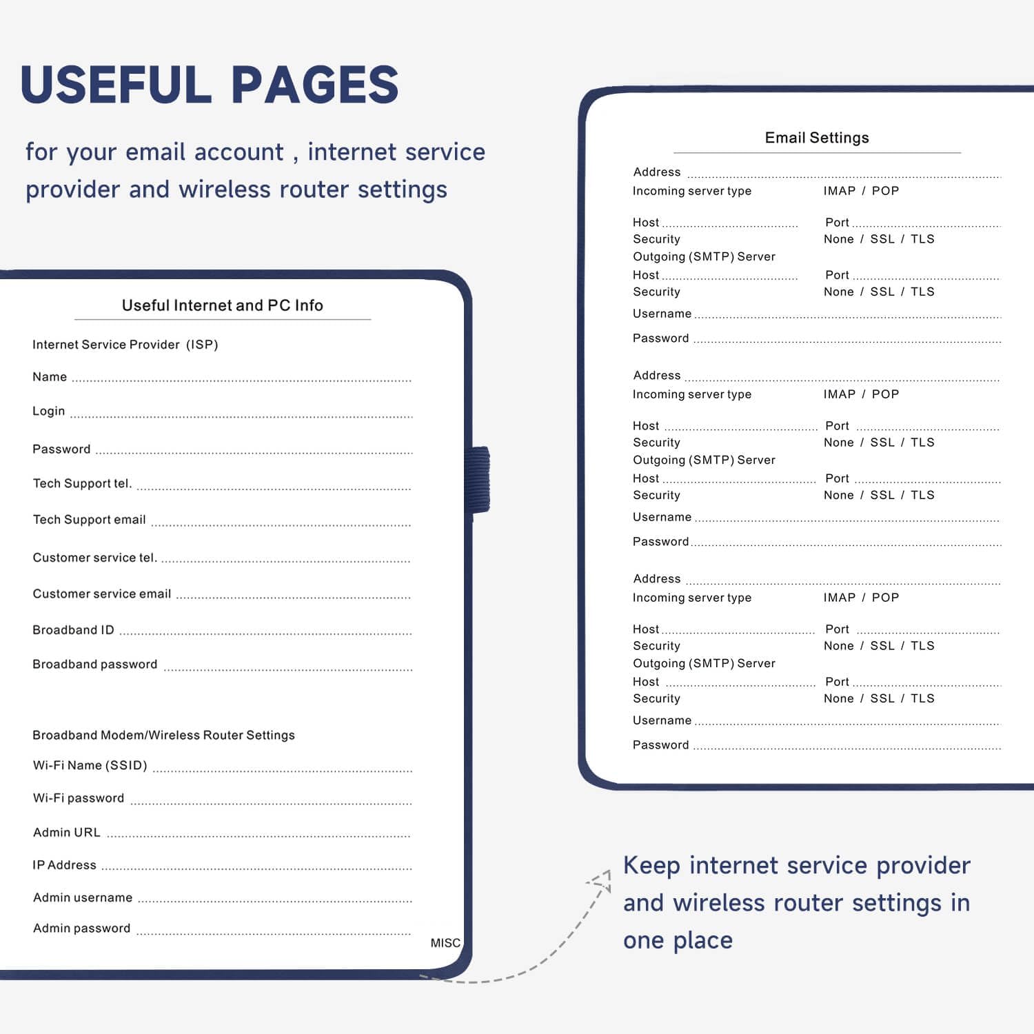- All-In-One Password Book & More - This password organizer has space to store all the information you may need when you surf the web, including software license information, email settings, wireless router settings, and notes section.