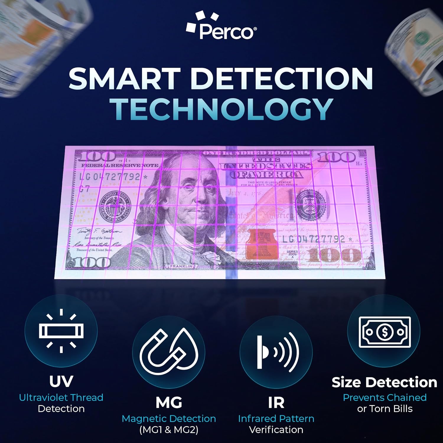 Perco Bill Counter and Counterfeit Detector Machine – Money Counter Machine with UV/MG1/MG2/IR, Voice Alerts, Keypad, Add & Batch Modes, Volume Control, Multi-Currency (USD/EUR/INR), LCD Display