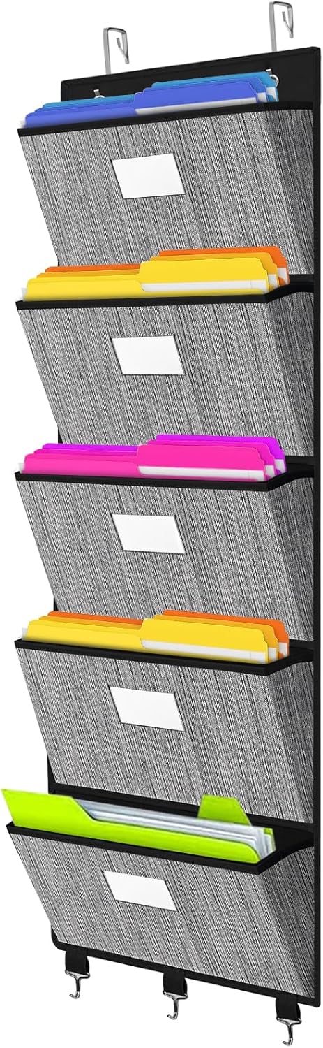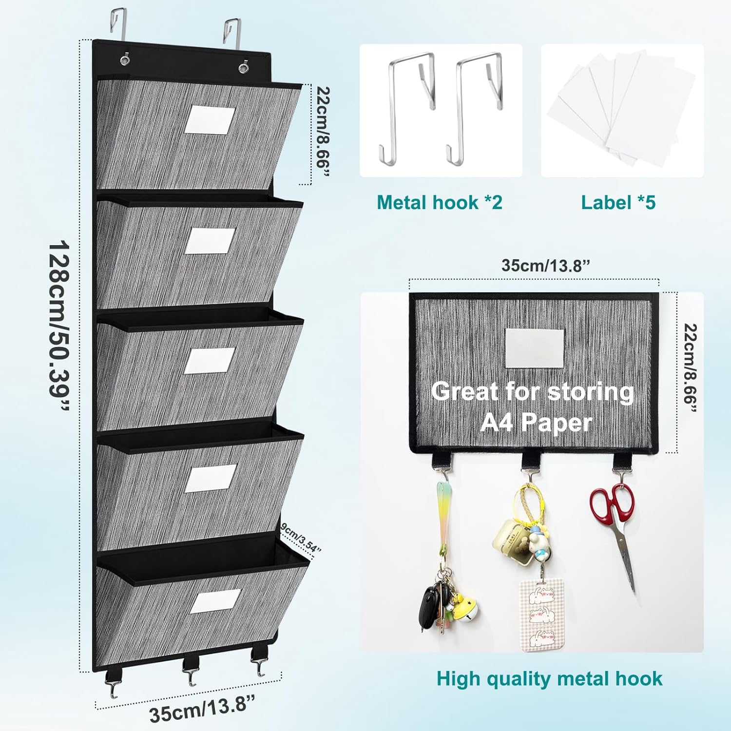 homyfort Over the Door File Organizer, Hanging File Folders, Wall Organizers and Storage for Mail, Magazine, Notebooks, Planners, Office, Classroom, 5 Extra Large Pockets, 50.39” Tall (Black)