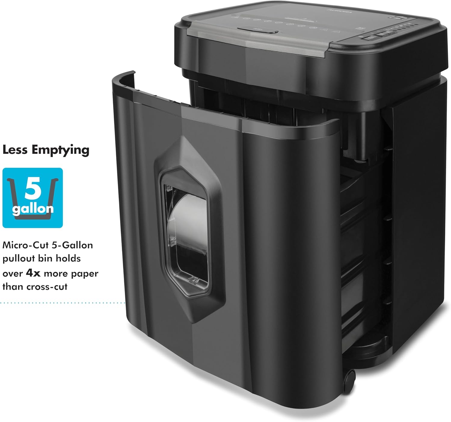 - High security micro-cut shreds paper and credit cards into small pieces (5/64 by 15/32 inches), security level P-5.