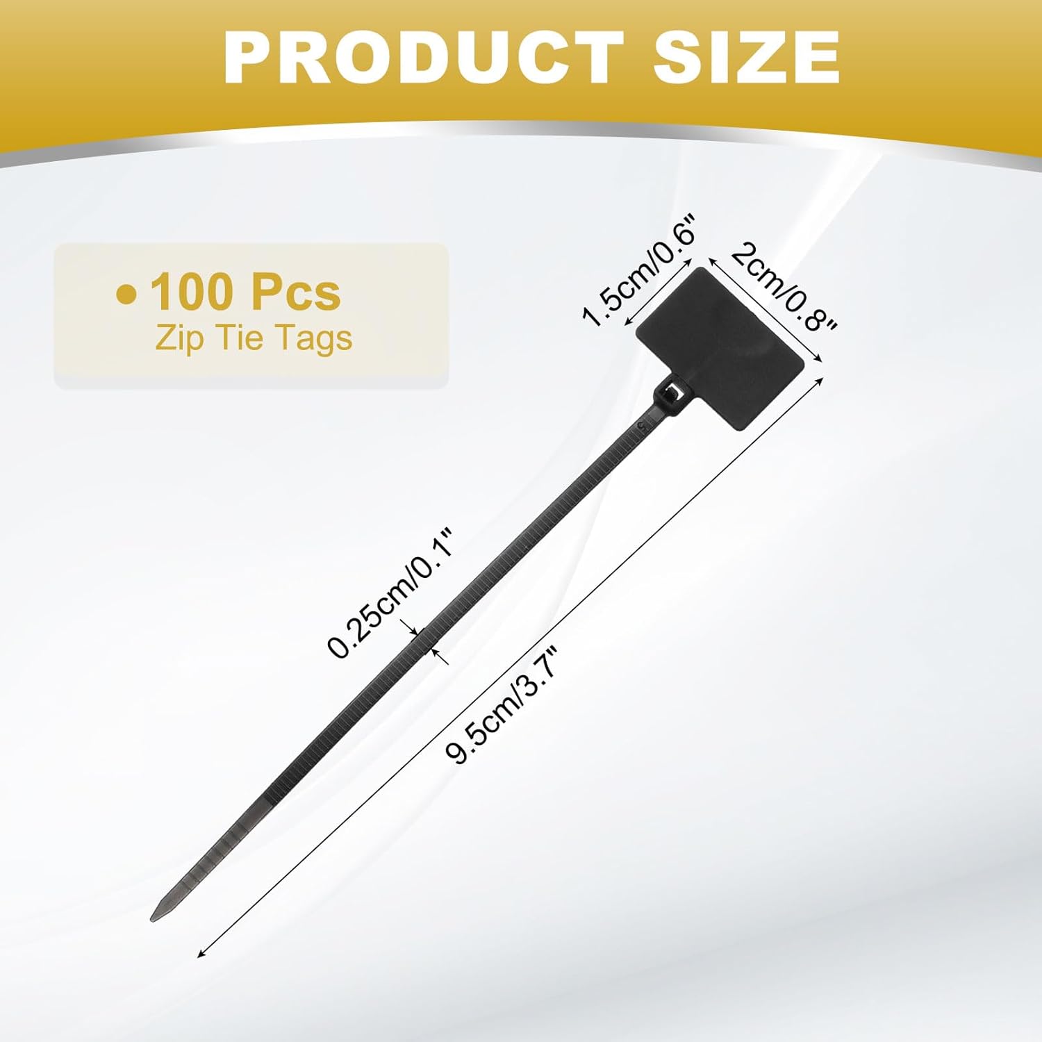 - Package & Size: You will receive 100 cable marker tags. The table tie size is 9.5 x 0.25 cm/3.7 x 0.1 inch (L*W), and the label size is 2 x 1.5 cm/0.8 x 0.6 inch (L*W), which is enough for your daily use. Note: Due to manual measurement, there will be a slight deviation of Β±1/2cm from the actual size.