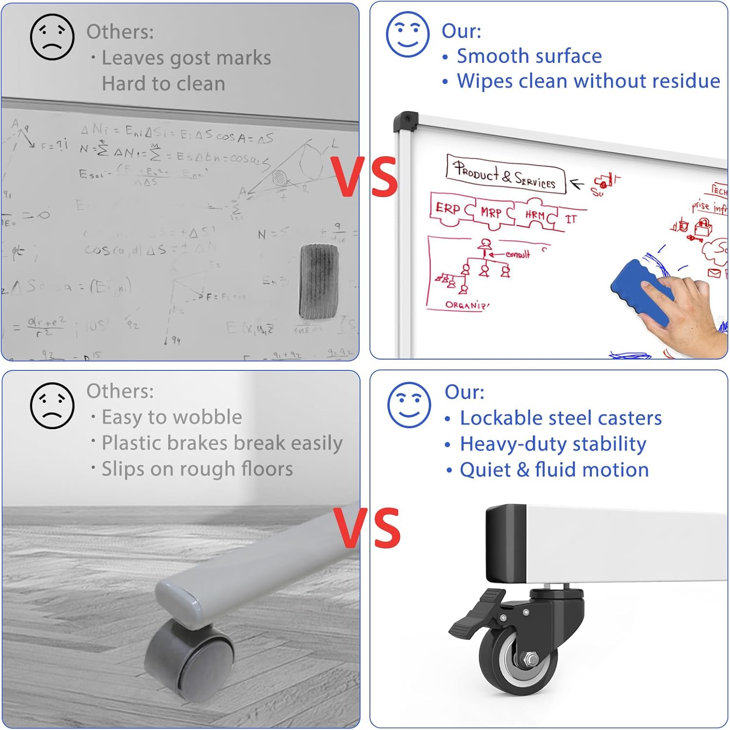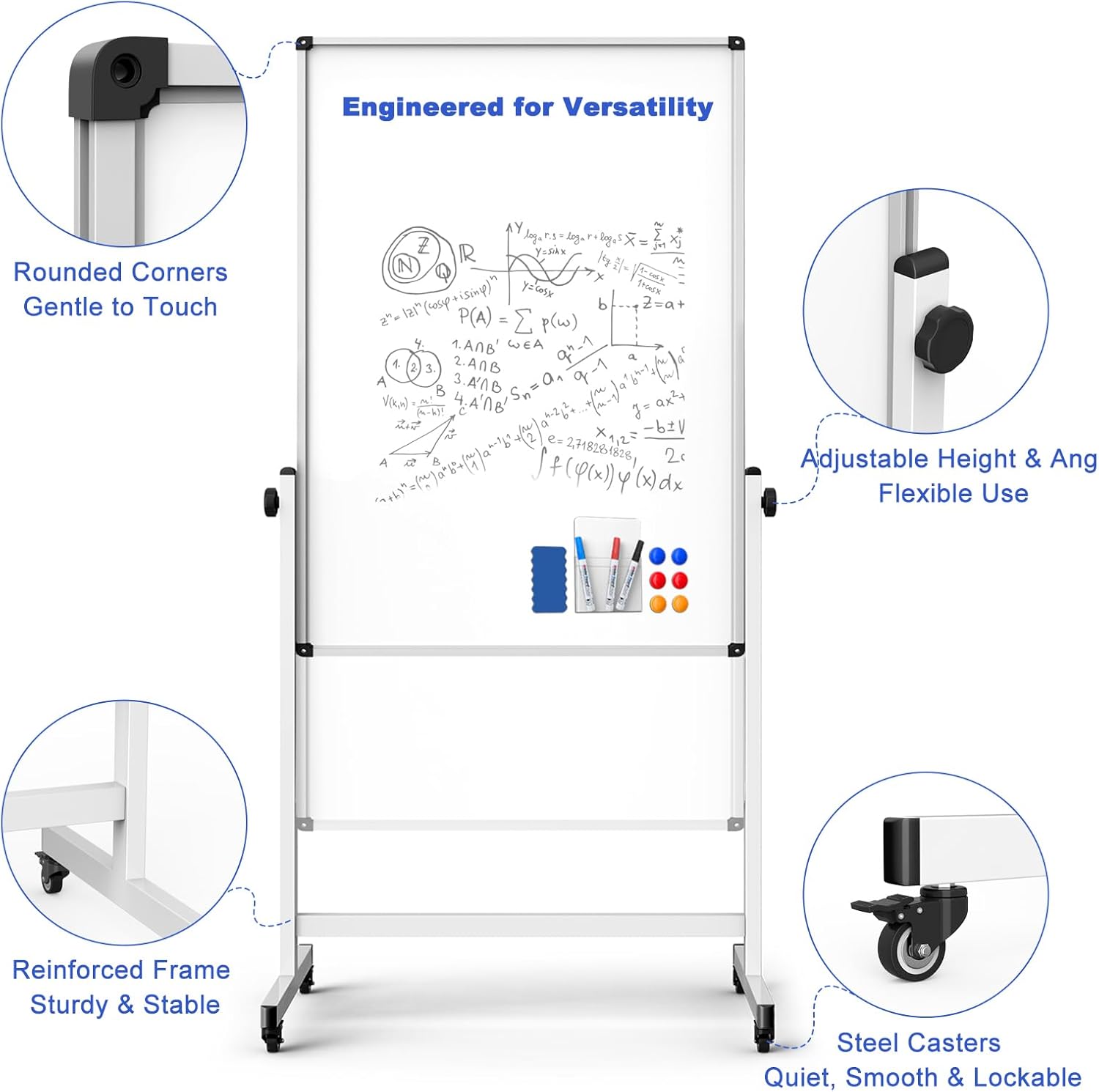 - Stable Frame with Smooth Rolling Casters: Built with integrated welded columns and a reinforced steel crossbar, this rolling whiteboard delivers excellent stability and long-lasting performance. Equipped with four 360Β° swivel silent caster wheels featuring locking brakes, it provides smooth, quiet mobility and secure positioning on carpet, hardwood, or tile floors.