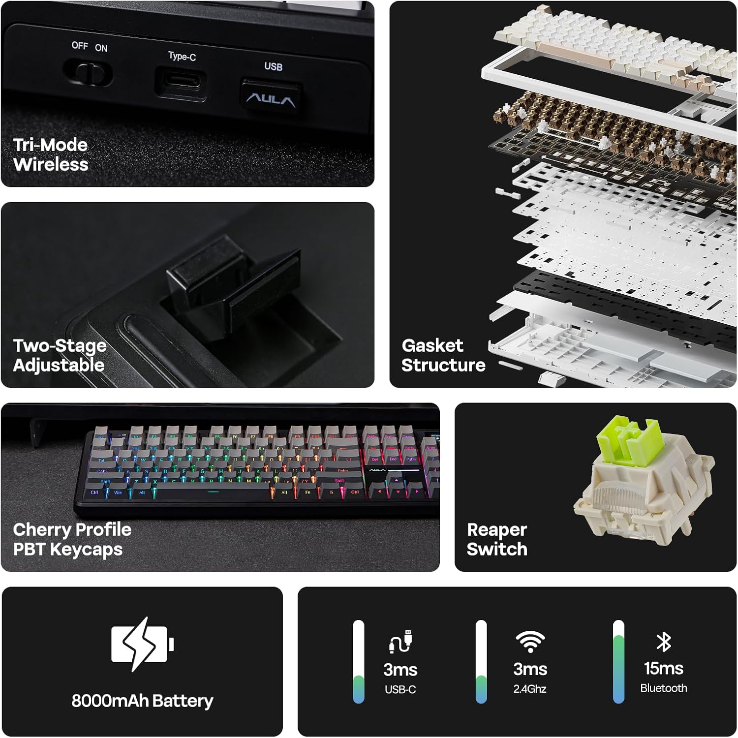 - Wireless Keyboard with Limitless Compatibility: Packed with an incredible 8000mAh rechargeable batteries, double the power average gaming keyboard offers, F108 PRO Wireless Keyboard grants up to 76 hours of continuous gameplay at peak performance with screen displaying at full brightness. Its versatile Bluetooth mode offers swift transaction from PC, Mac Laptop to Android Tablet, while the 2.4GHz wireless and USB Cable mode promise competitive-level stability and responsiveness with 1000Hz polling rate