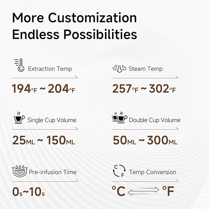 - Optional Program Range: single cup 25~150ml, double cup 50~300ml; hot extraction temperature range 194Β°F~204Β°F, cold extraction range 77Β°F; steam temperature range: 257Β°F~302Β°F; pre-infusion time range: 0~10 seconds; temperature display conversion: β and β can be converted to each other.