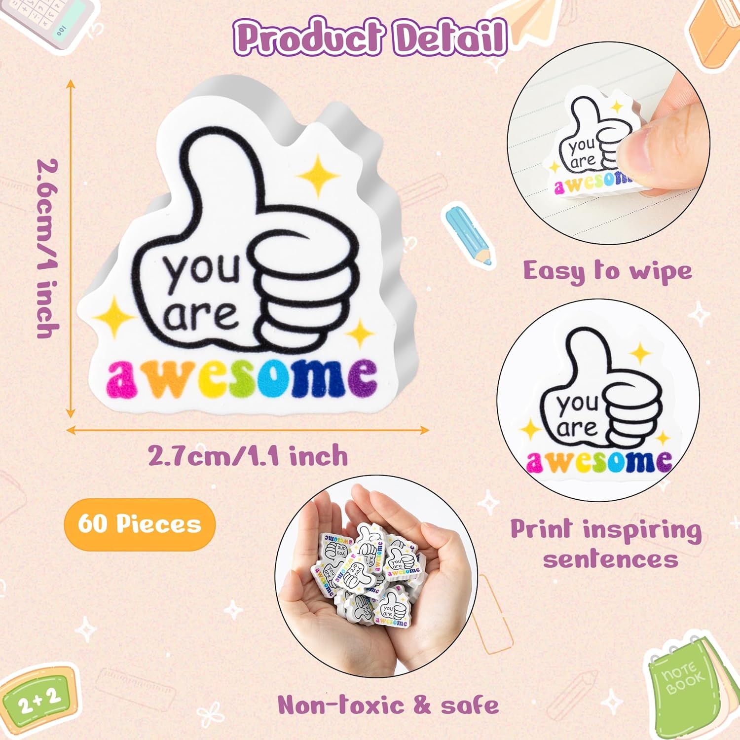 - What You Will Get: 60 thumbs-shaped incentive erasers, printed with "You Are Awesome", providing you with erasers for multiple uses; Whether you are a student or a teacher, the quantity can meet all your needs