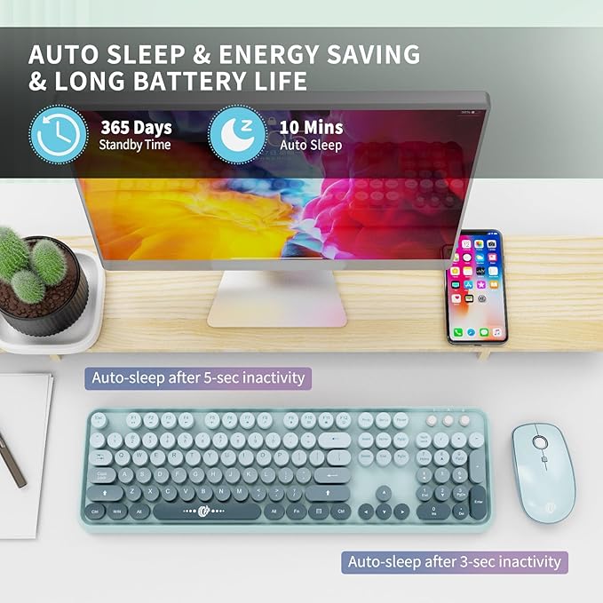 - 【 Wireless Keyboard Mouse Combo】The inspiration for these cute rounded keys comes from vintage typewriters offering you visual enjoyment and a retro feeling to type. With colorful key caps, make you be distinctive in the office and work full of fun.
