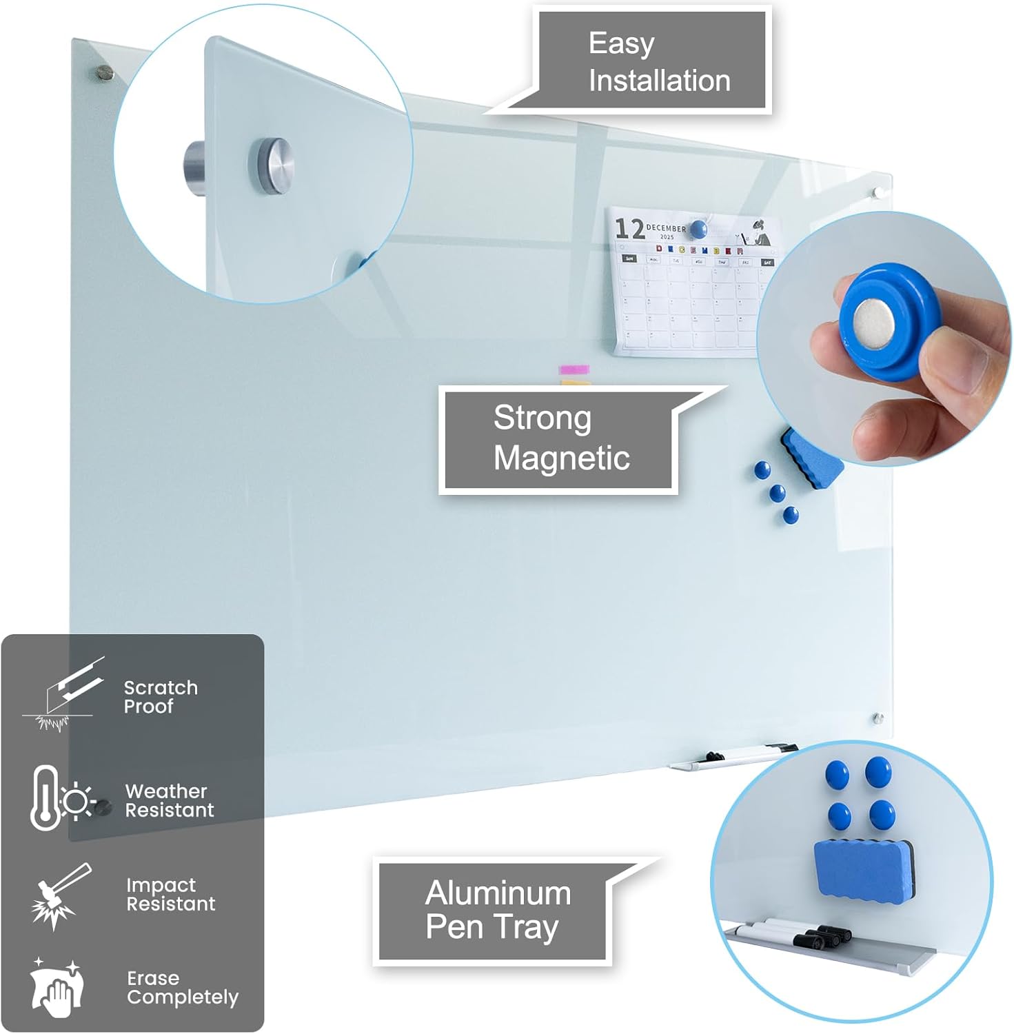 - Long life for heavy-duty usage:Made with premium tempered glass,strong magnetic surface.More than 10 years long life compared with normal whiteboard.Premium tempered glass meet with US SGCC ANSI Z97.1-2015 & EU: EN2050-1.