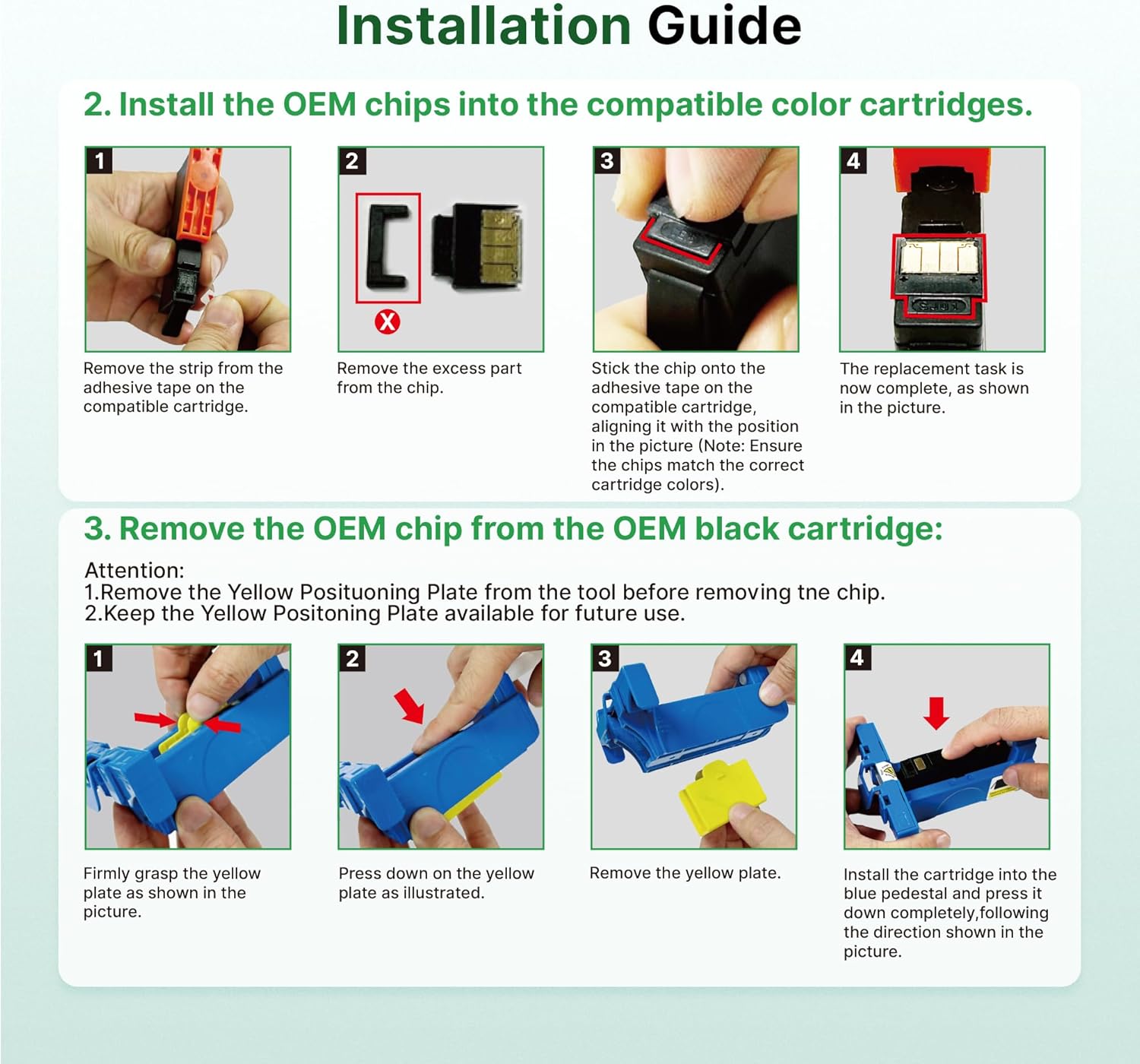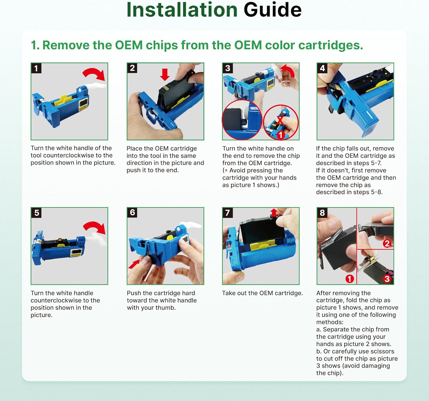 - Chip Replacement Guide: β You need to remove the original chips on ink cartridges through our tool. β‘Peel off the tape of the new compatible cartridge and Stick the chip onto the tape