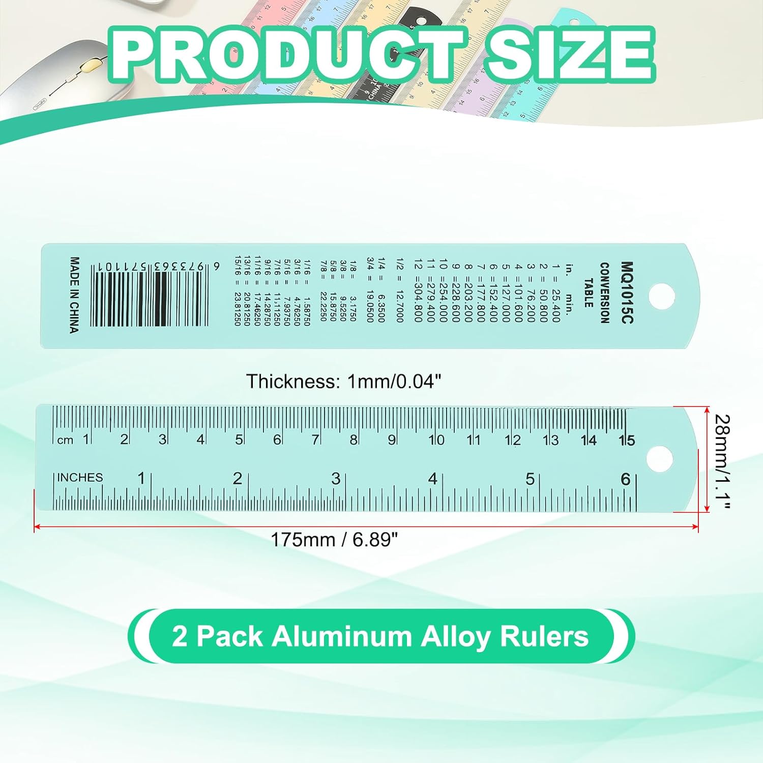 - Specification: Color: Blue Green; Material: Aluminum Alloy; Mileage: 15cm/6"; Total Length: 175mm / 6.89 inch; Width*Thickness: 28 x 1mm / 1.1 x 0.04 inch; Packing List: 2 Pack x Aluminum Alloy Rulers