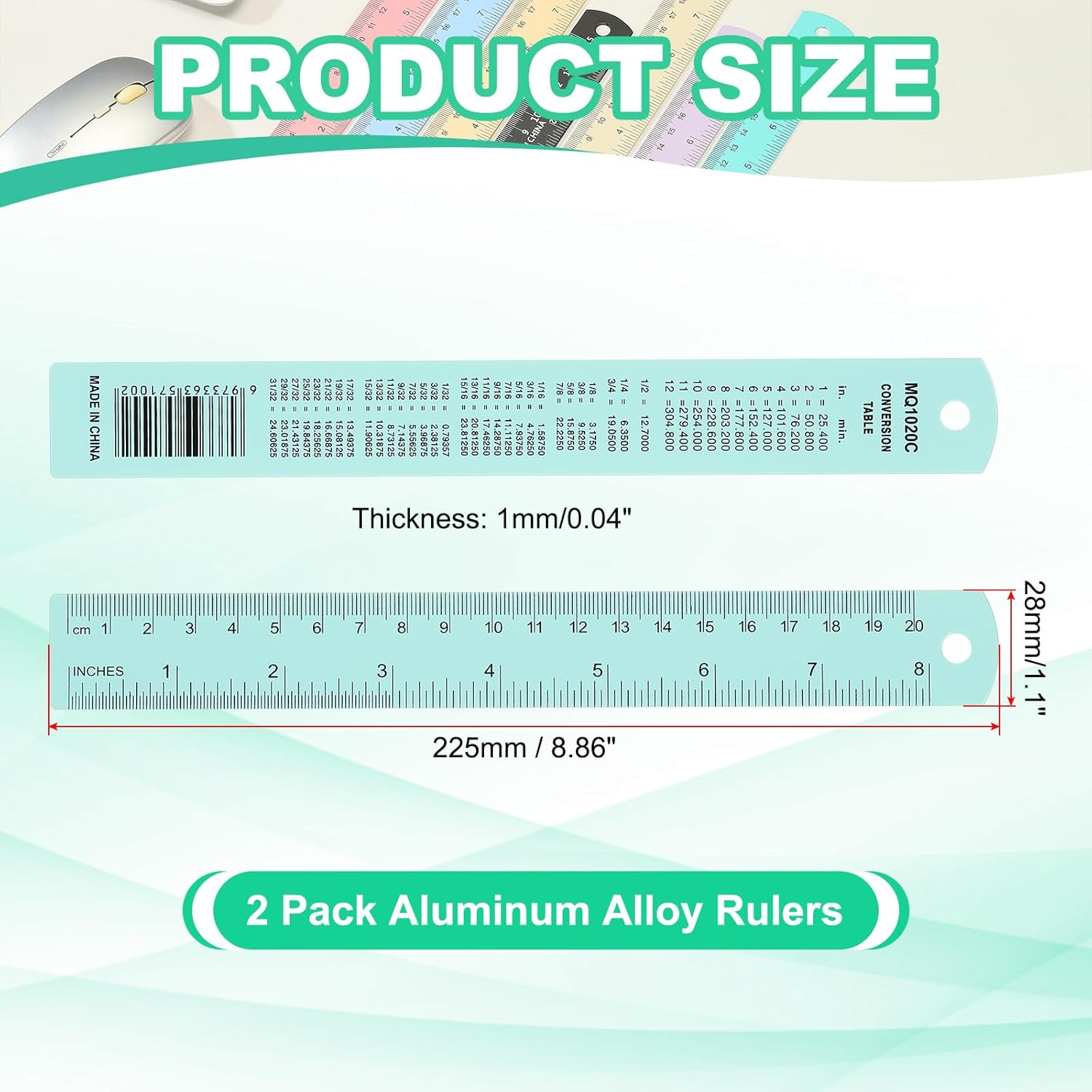- Specification: Color: Blue Green; Material: Aluminum Alloy; Mileage: 20cm/8"; Total Length: 225mm / 8.86 inch; Width*Thickness: 28 x 1mm / 1.1 x 0.04 inch; Packing List: 2 Pack x Aluminum Alloy Rulers