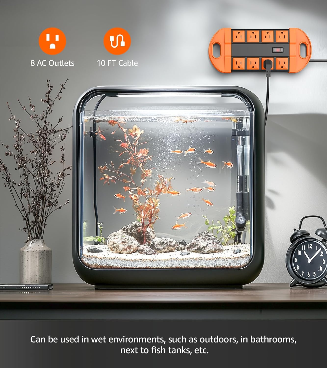 CCCEI Outdoor Power Strip Weatherproof with 8 Plug, Waterproof Extension Cord with Multiple Outlets, Christmas Exterior Garden Yard Surge Protector 10FT, Orange.
