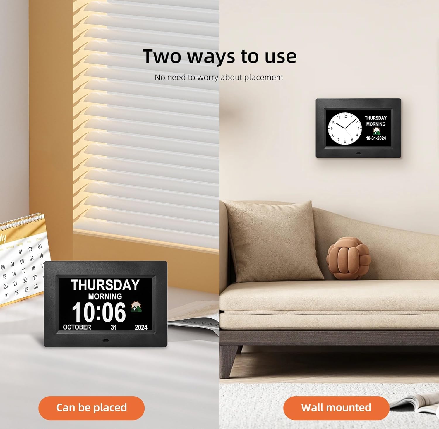 - 【Elderly-Friendly Design】: With a large 7-inch IPS full-view HD screen, extra-large fonts, customizable colors, and voice time announcements, this clock caters to the needs of the elderly, ensuring clear readability and accessibility.