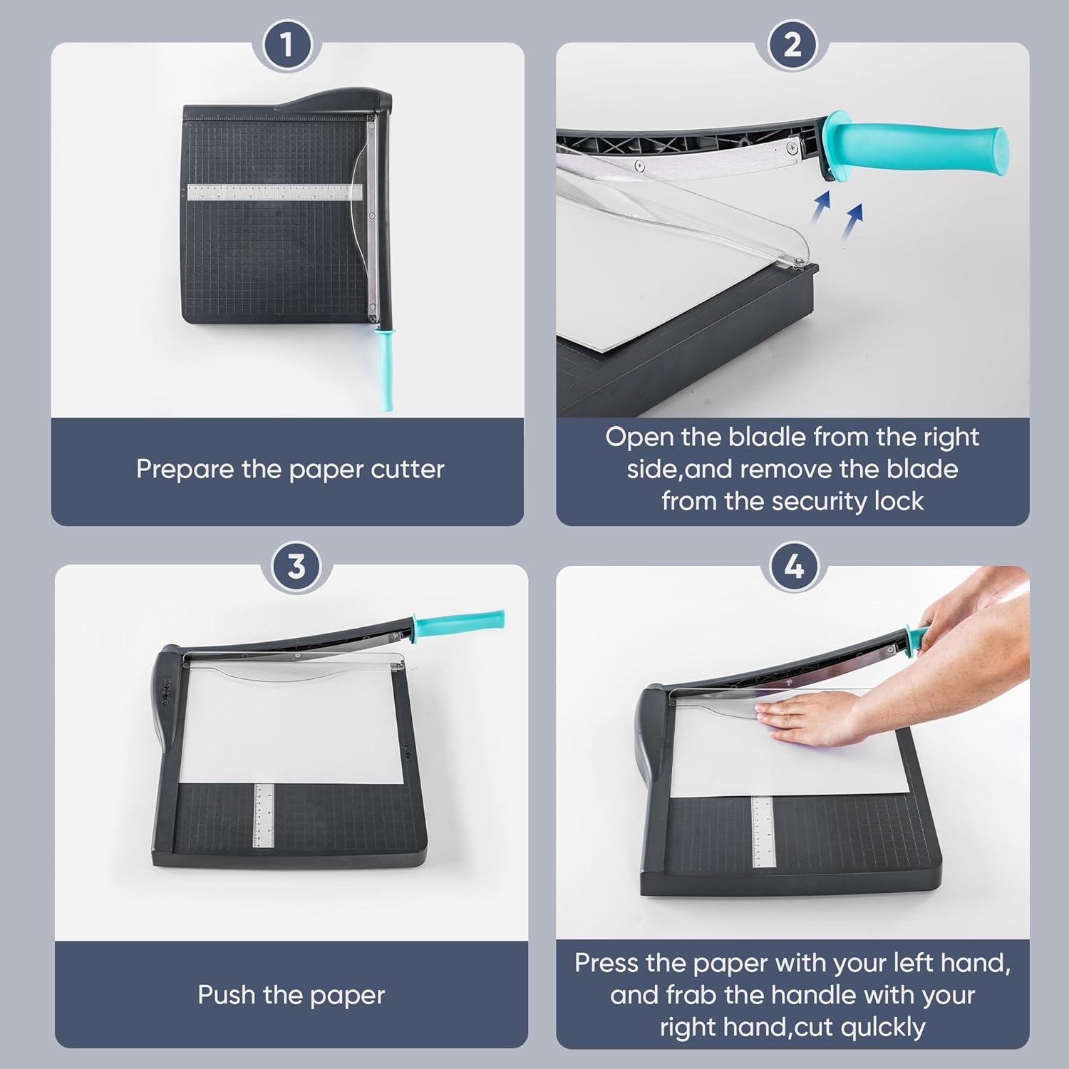 - 【Safety Operation】The transparent plastic guard protects your fingers from sharp blades and features a paper locking function. The blade latch hook locks the trimming arm in place when not in use. Notice: Keep this heavy duty paper cutter away from children under 12
