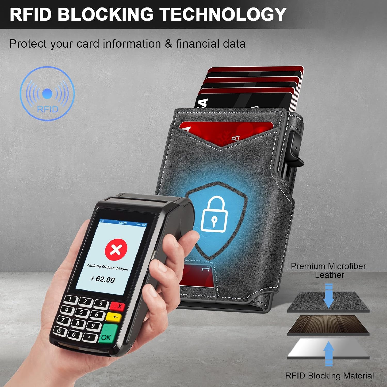 - RFID BLOCKING: The RFID Card holder of this metal wallet for men blocks unauthorized scans of your credit cards, debit cards, and driverβs license, providing maximum protection for your private information.