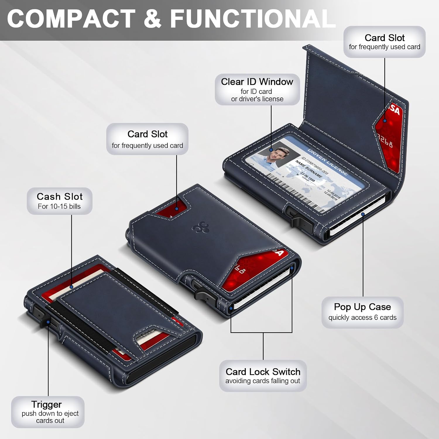 - EXPANDABLE CASH SLOT: Unlike typical money clip wallets for men, the back of this minimalist wallet for men is upgraded with an expandable cash slot, capable of holding a few folded bills or up to 3 cards.