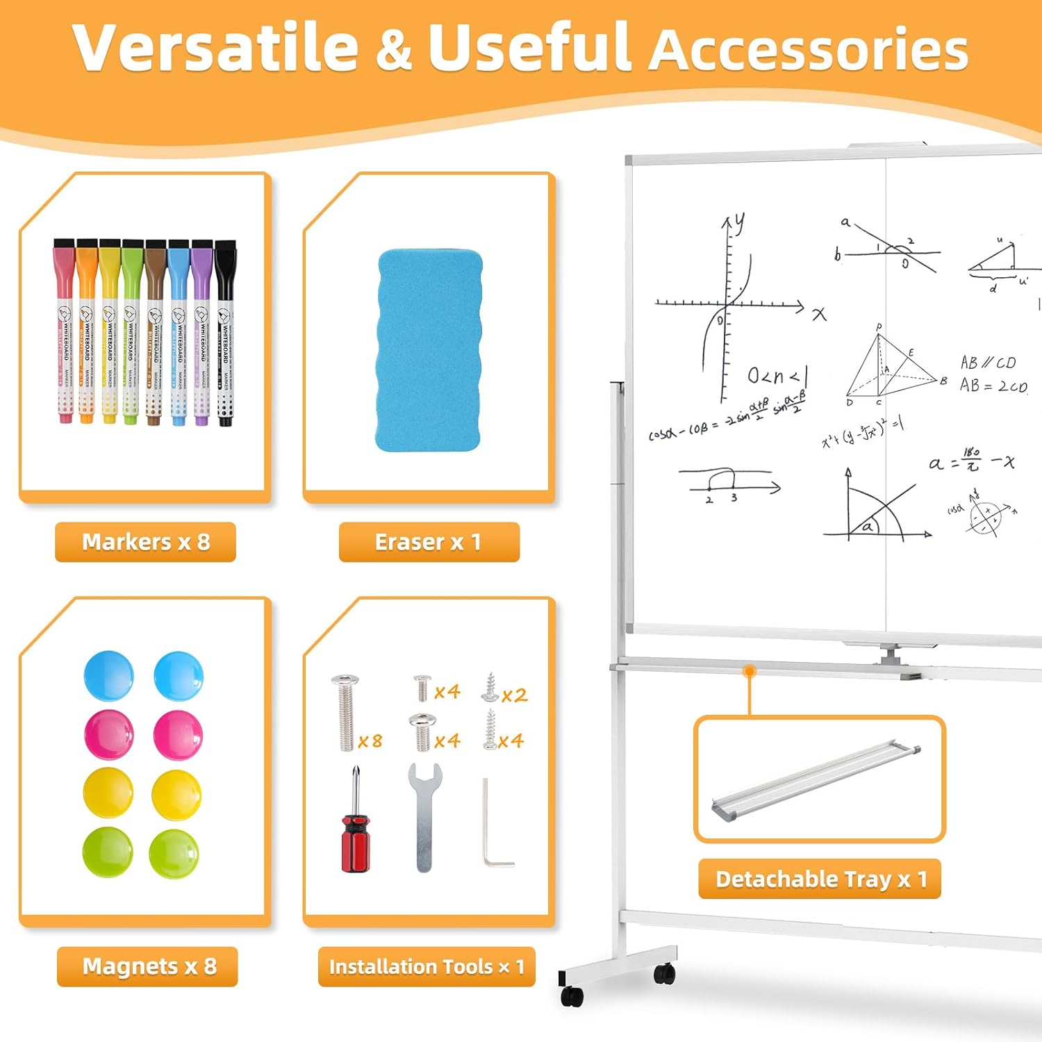 - Solid & Stable - Built with premium materials, rust protection, ABS corners, and a sturdy frame, this rolling white board is durable and secure. Four locking caster wheels ensure easy mobility and complete stability when writing or wiping.