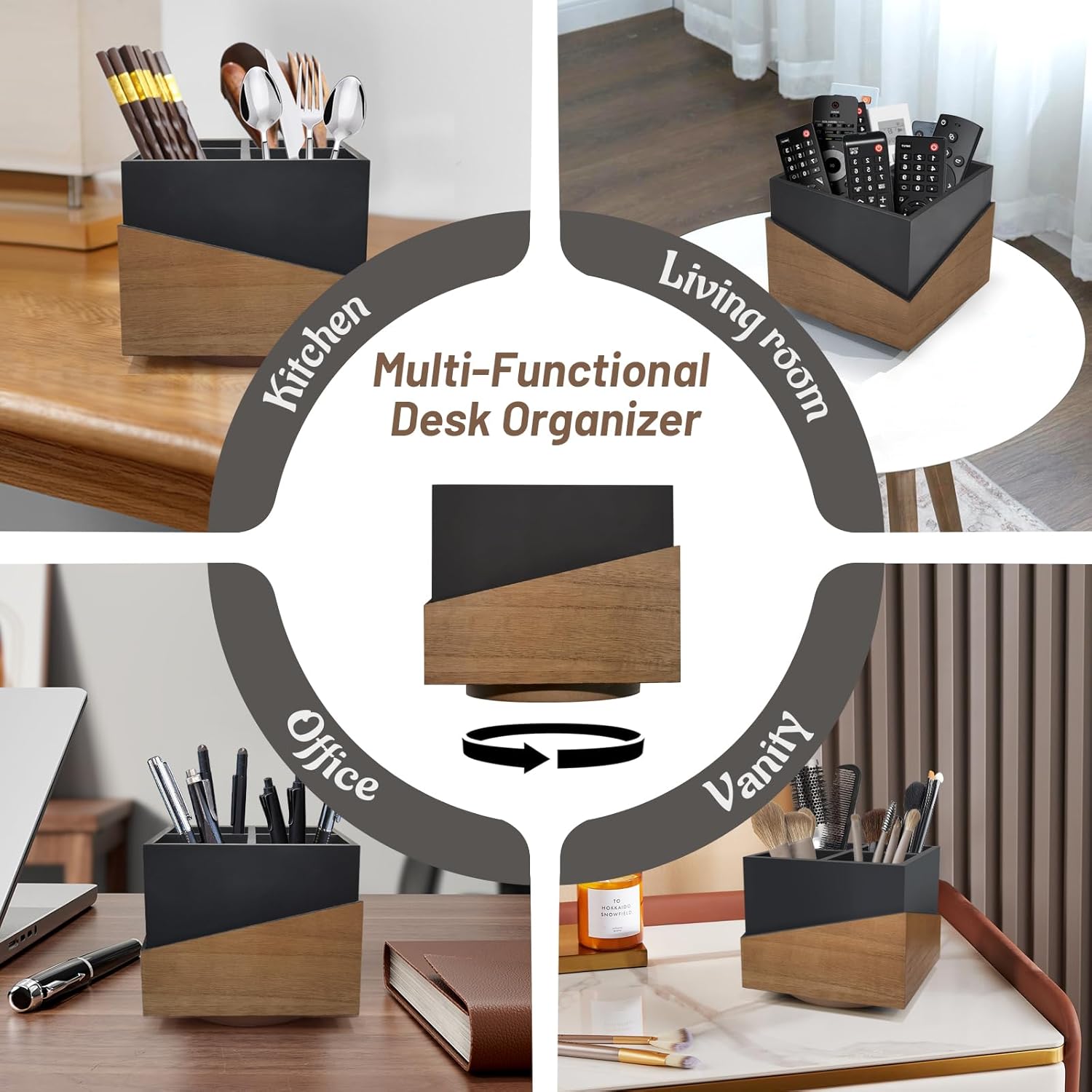Rotating Pen Holder for Desk, Black Pencil Holder Pen Cup with Wood Grain Veneer, Wooden Desktop Pen Organizer Desk Caddy Organizer for Makeup Brush, Flatware, Remote Control