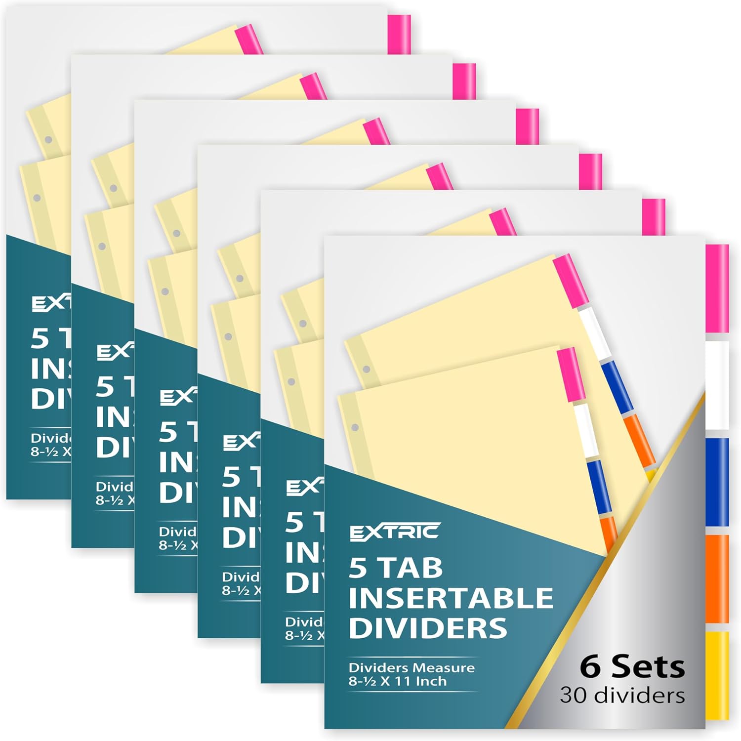 5-Tab Binder Dividers for 3 Ring Binder, Insertable Multicolor Big Tabs, Letter Size Paper Divider, 8.5 x 11 inch, 6 Sets (30 Dividers Total)