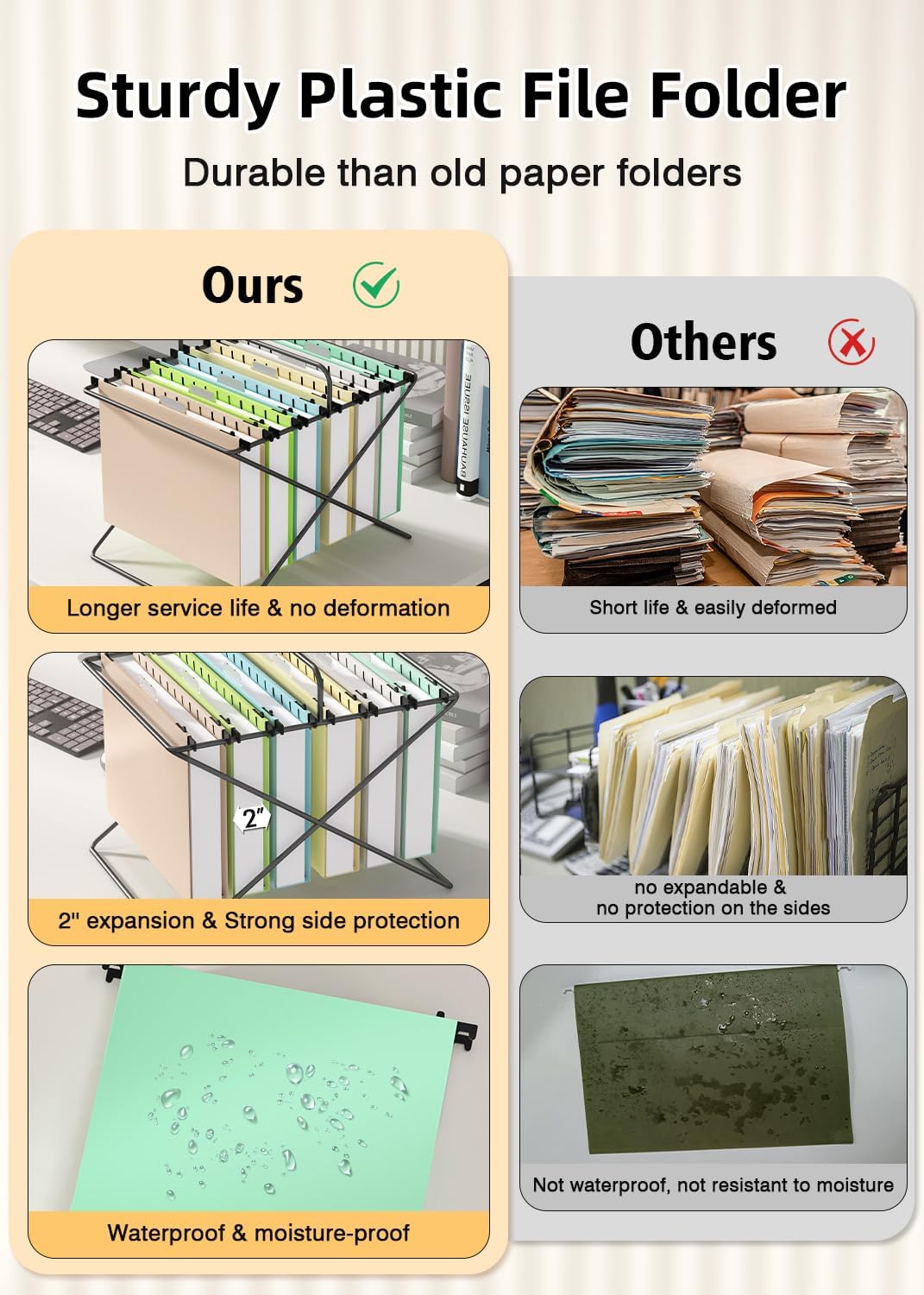 - 【EXTRA CAPACITY FILE FOLDERS】 : The hanging files for filing cabinet come with a 2-inch expansion strips of plastic board to place into the bottom of the folder to make the flat edge, which makes them able to hold up to 500 sheets of letter size paper. Each folder is 9.25 x 11.8 inch