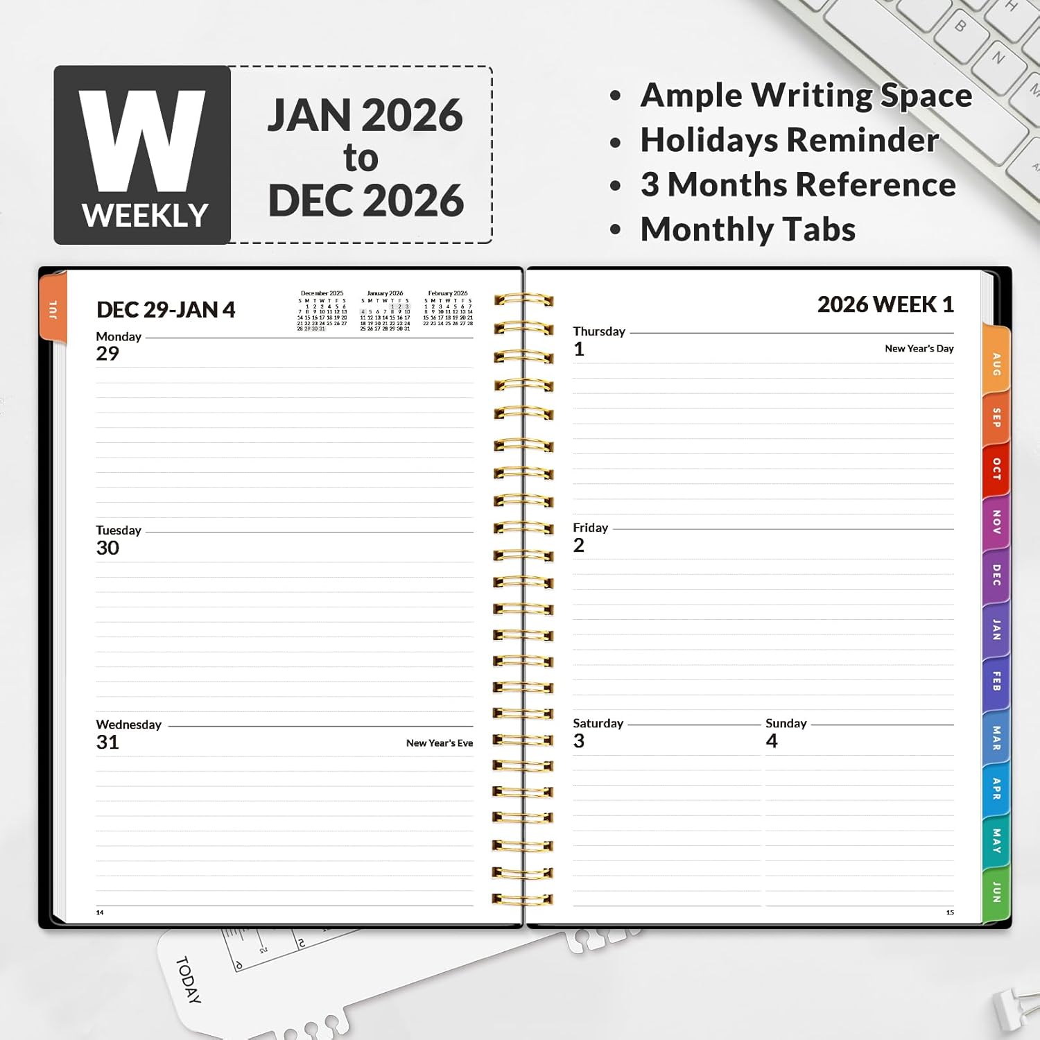- Weekly View - 2-page weekly spread from Monday to Sunday provides generous lined writing space along with popular holidays and 3-month reference previews, allowing for easy appointment, note, and daily task management.