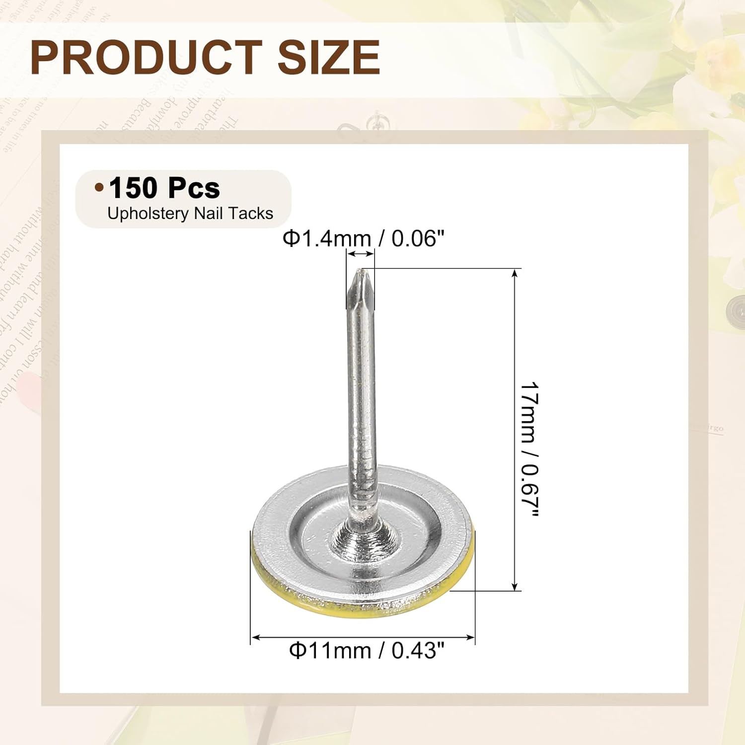 - [Size & Quantity] - The package comes with 150pcs decorative upholstery tacks. Sufficient quantity to meet your different daily needs. The overall size of upholstery nails is about 11mm x 17mm/0.43-inch x 0.67-inch(D*H)