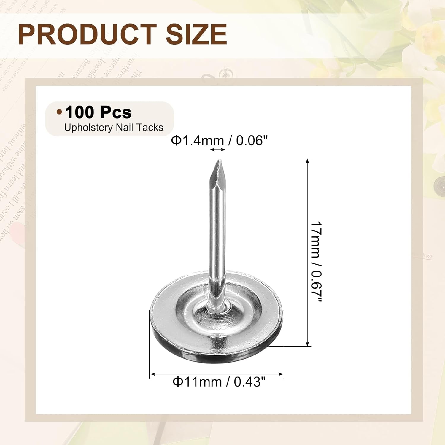 - [Size & Quantity] - The package comes with 100pcs decorative upholstery tacks. Sufficient quantity to meet your different daily needs. The overall size of upholstery nails is about 11mm x 17mm/0.43-inch x 0.67-inch(D*H)