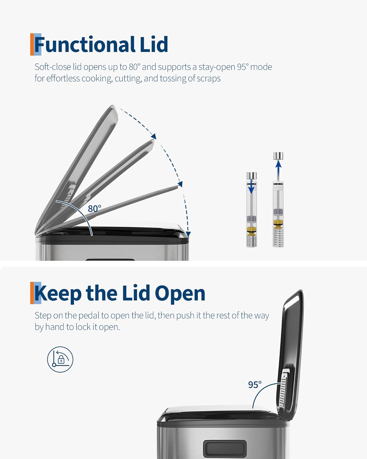 - [PRACTICAL DESIGN] – GarveeHome’s dual trash and recycling bins put ease of use first. Ergonomic side handles let you lift and relocate the entire unit effortlessly. The soft-close lid opens to 80° without collision with standard kitchen island edges, and locks at 95° for hands-free cooking prep and scrap disposal. Dual inner buckets with weighted-edge lids trap odors separately. A custom liner ring secures any standard bag snugly, eliminating slips, bunching, and overhang