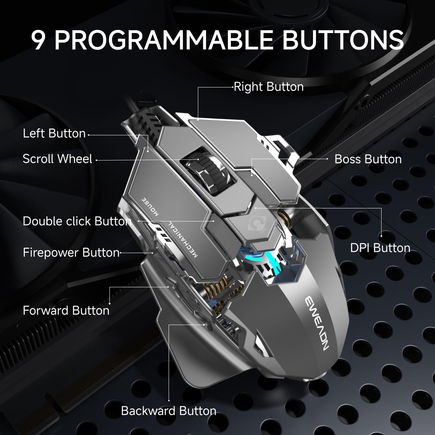 EWEADN G5 Wired Gaming Mouse, Ergonomic RGB Computer Mouse, 12800 Adjustable DPI, 9 Programmable Macro Buttons with Rapid Fire Key Compatible for PC/Laptop/Windows-Grey&White
