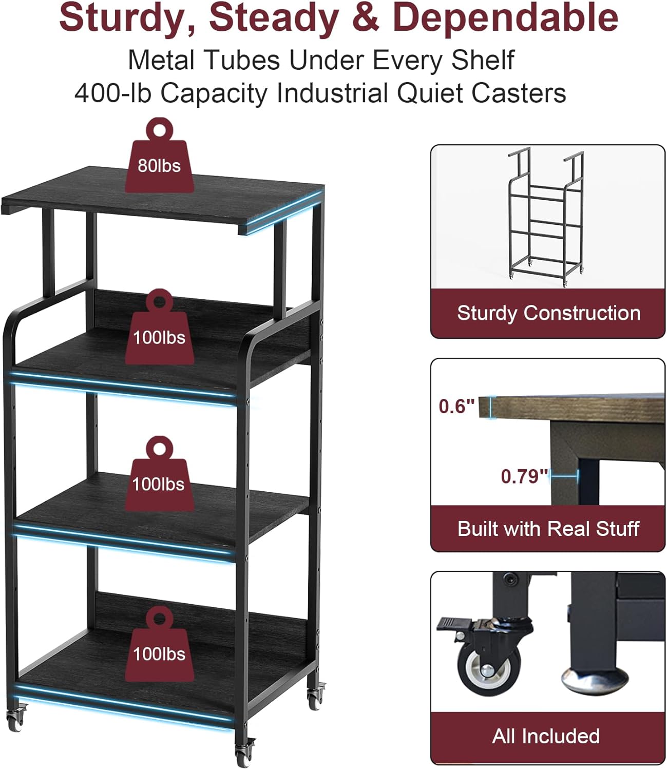 4 Tier Printer Stand with Storage Shelf, Large Tall Printer Table for Home Office, Mobile Printer Cart with Industrial Wheels for Paper Shredder Scanner Fax Heat Press Small Space Organization (Black)