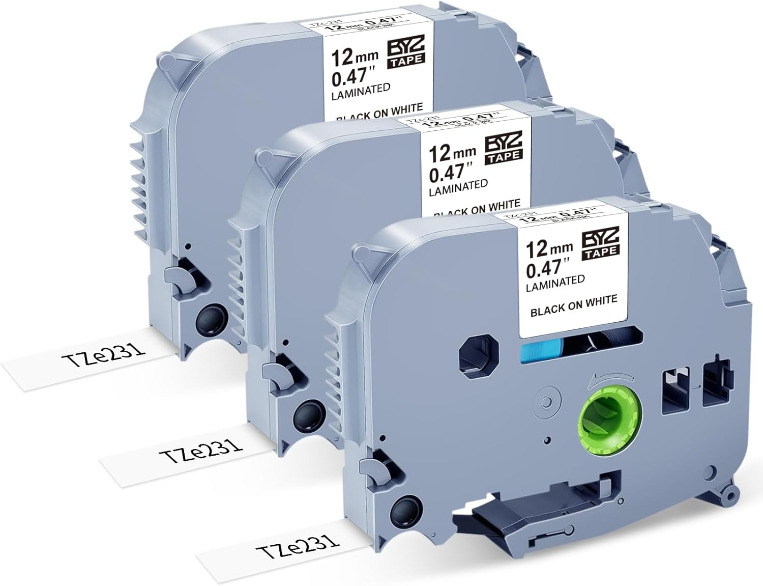 - Item Information: 3-Pack TZe-231 TZe231 TZ231 label maker tape replacement for Brother tz tape 12mm 0.47 white laminated. Color: Black on White. Width x Length: 1/2 inch x 26.2 feet (12mm x 8m).