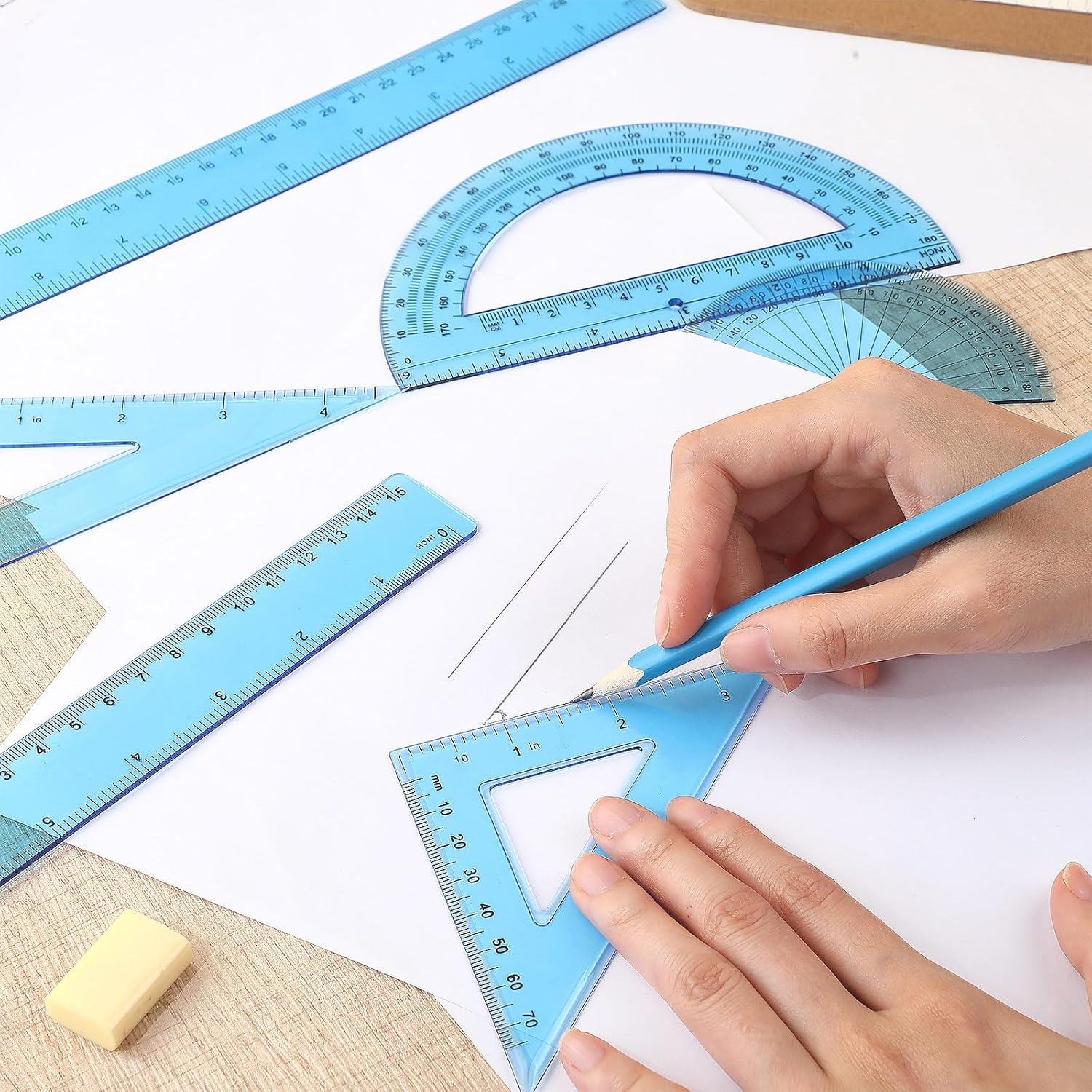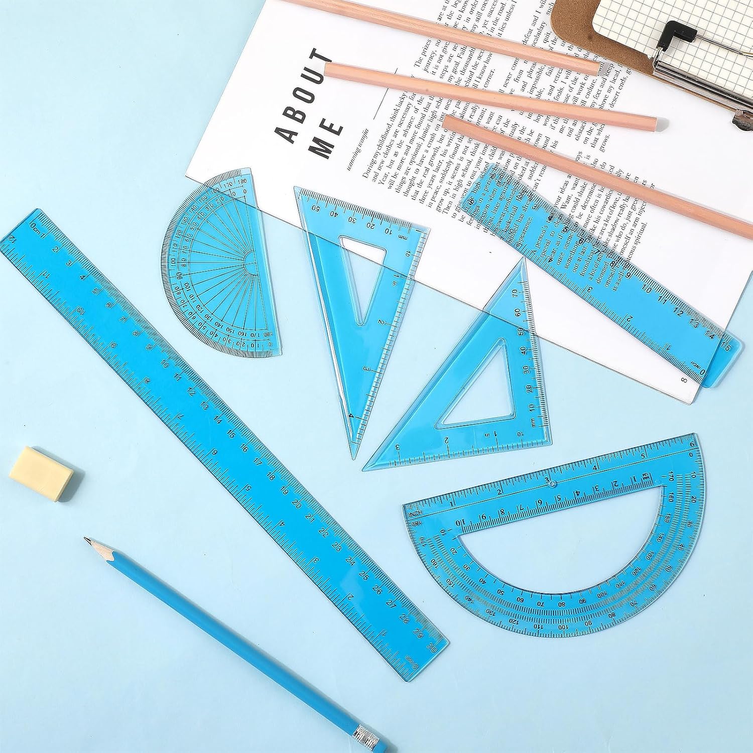 Tenare 1 Set Plastic Clear Math Set Includes Protractor Triangle Rulers 12 Inch 6 Inch Straight Geometry Math Transparent Ruler Measuring Tool for School Office Home Supplies(Blue)