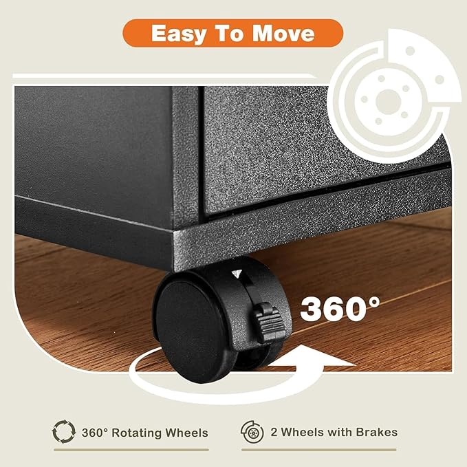 - Easy Mobility: Convenience is key in our busy lives, which is why our storage cabinet is designed with your ease in mind. Equipped with 4 wheels, including 2 with brakes, it offers effortless mobility and stability. Enjoy the flexibility of effortlessly adapting your storage setup to accommodate your evolving lifestyle.