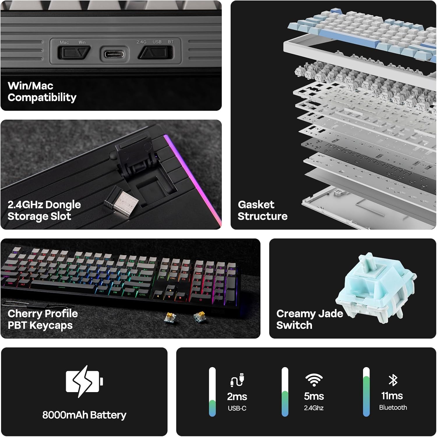 - Long-Lasting Wireless Keyboard: Liberate your setup with the ultimate freedom of a stable wireless keyboard boasting the outstanding 8000mAh battery. Unlocking a realm of unrestricted movement and sustained performance with this tri-mode wireless keyboard, without frustrating cable drag hindering swift mouse movements, for seamless transition between up to 5 paired devices under cable, 2.4Ghz and Bluetooth modes. PC, Mac laptop, Android tablet or gaming console, whichever devices you game on, the 160-hour wire-free battery life make inconvenient mid-game recharge a worry in the past.