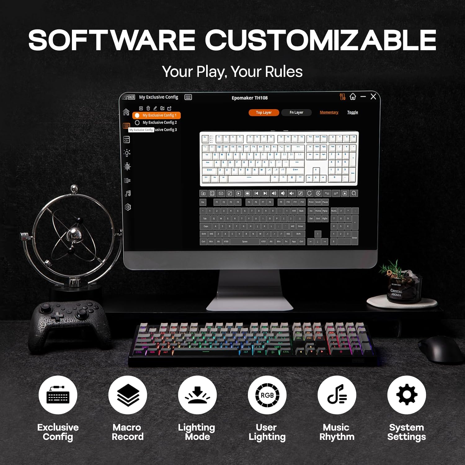 - Hot-Swappable Custom Keyboard: Personalize functions, sounds and feel of each keystroke as you please, with the TH108 custom keyboard and its powerful setup. Try out the various typing style and acoustic feedback of mainstream 5-pin mechanical switches with the hot-swappable PCBA of TH108; and bask in the thocky melody of Creamy Jade or the tranquil silence of Sea Salt Silent switches of us, both of which factory-lubed, for out-of-box perfection. Experimenting the intuitive driver to configure layout, macros, backlight and sensitivity of keyboard, for the ultimate PC peripheral that matches your gaming style and workflow.