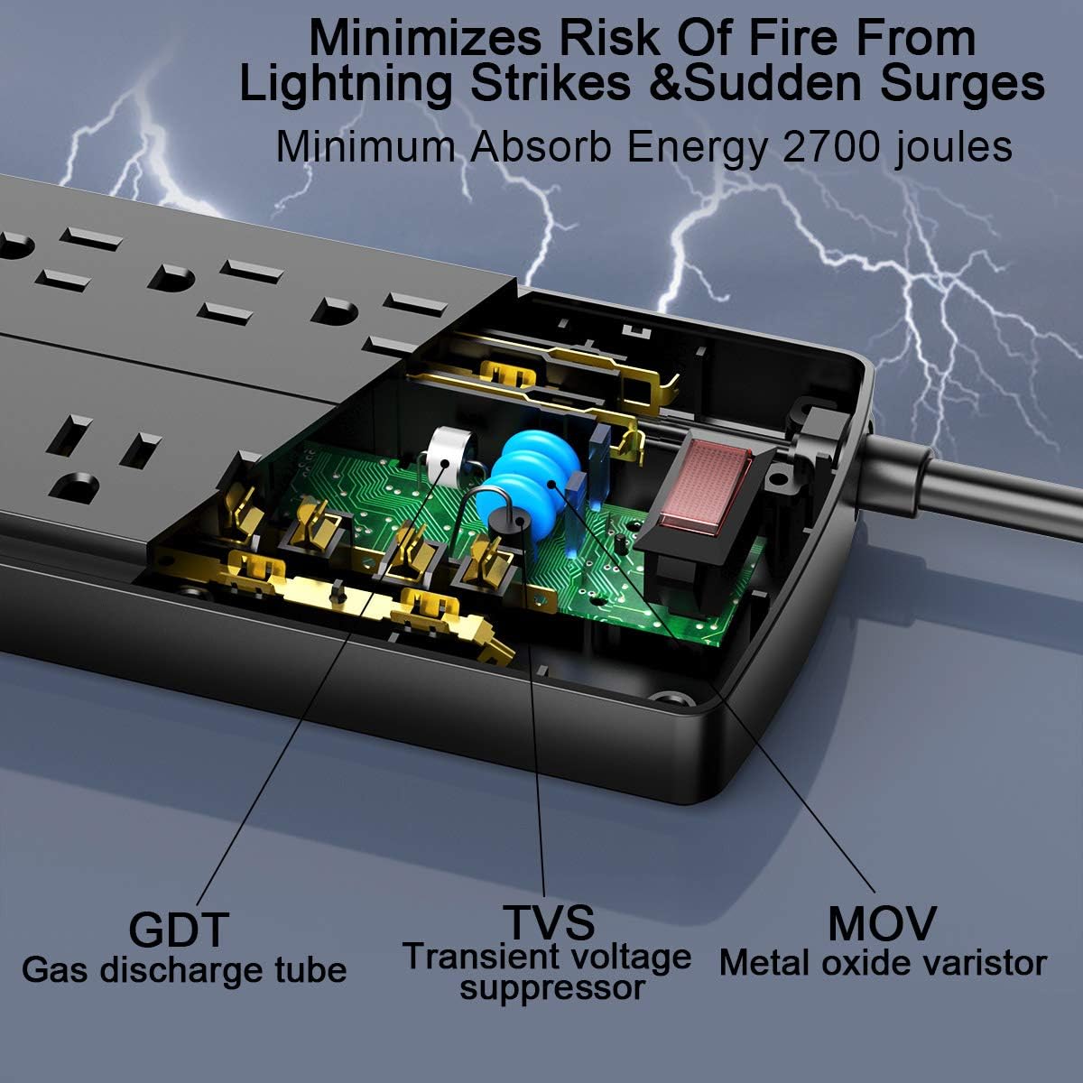 - 【12 AC Surge Protector Outlets】- The 3 level complementary Surge Protector Circuit which composed of TVS (transient voltage suppressor), MOV (metal oxide varistor), GDT (gas discharge tube), with minimum 2700 Joules energy absorbing capacity, could protect your devices much more quickly and reliably than other brand's 1 level MOV Surge Protection Circuits.