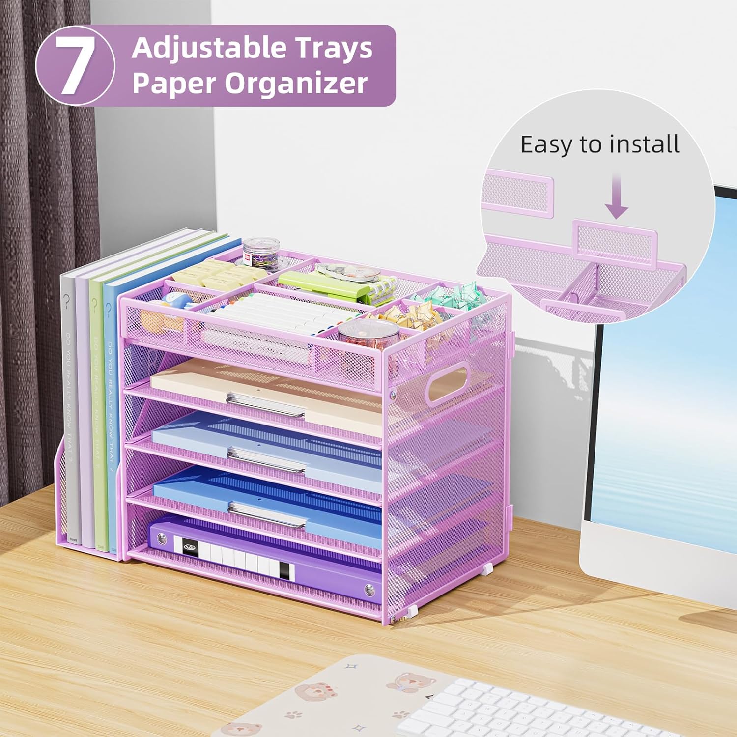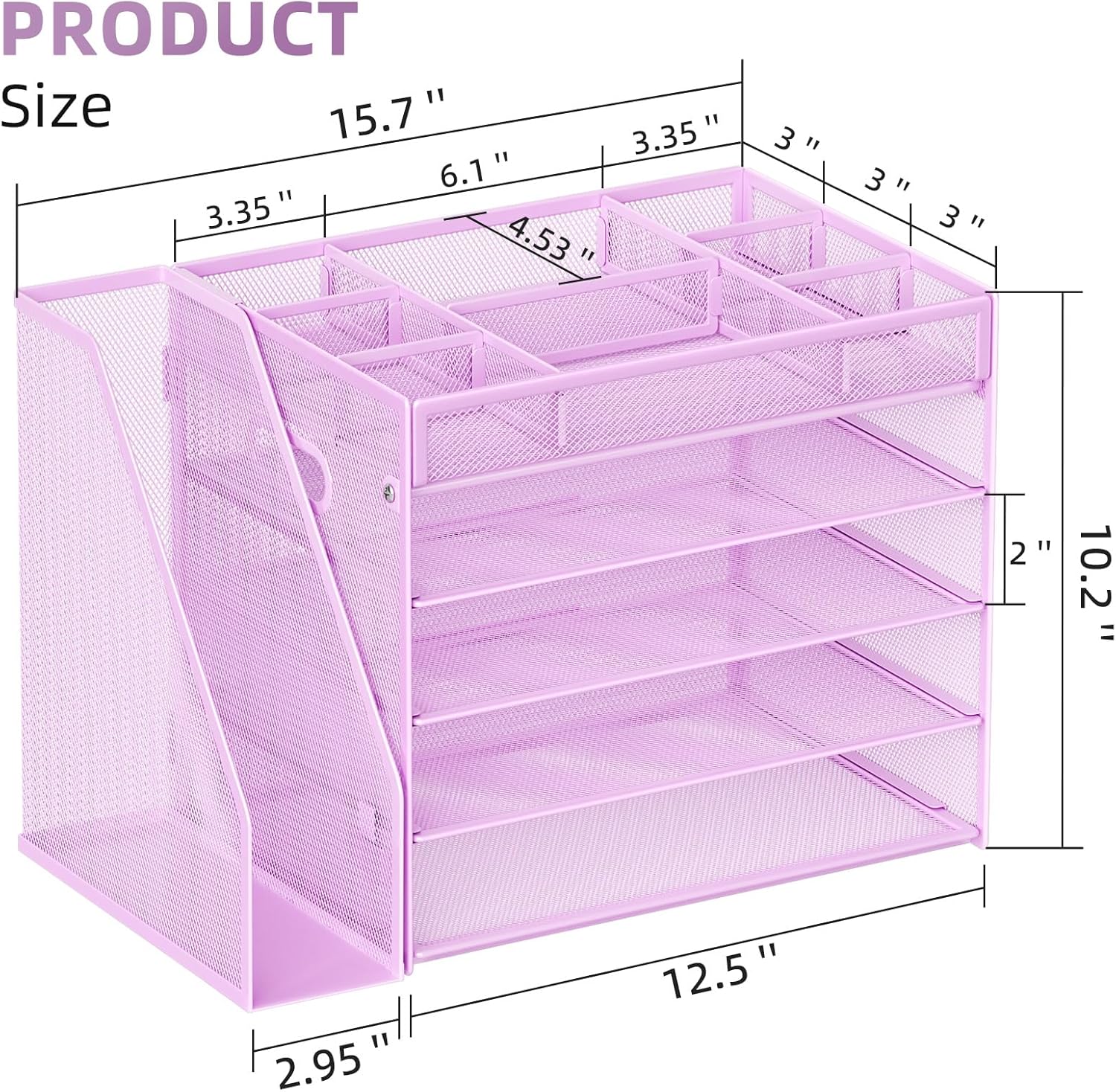 Marbrasse 5-Tier Desk Organizer with File Holder,Paper Letter Tray Organizer,Desktop File Organizer with Adjustable Compartments,Mesh Desk Organizers and Accessories for Office Supplies,Purple