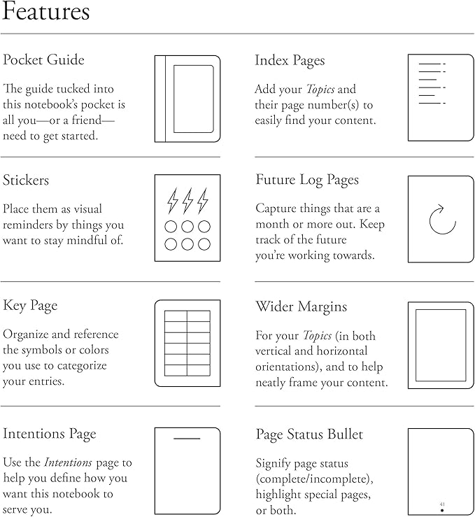 - Sticker Sheet: Quickly set up your Monthly Logs with the date-related stickers. Stick the metallic dots and bolts next to things you want to stay mindful of, both in and outside of your notebook.