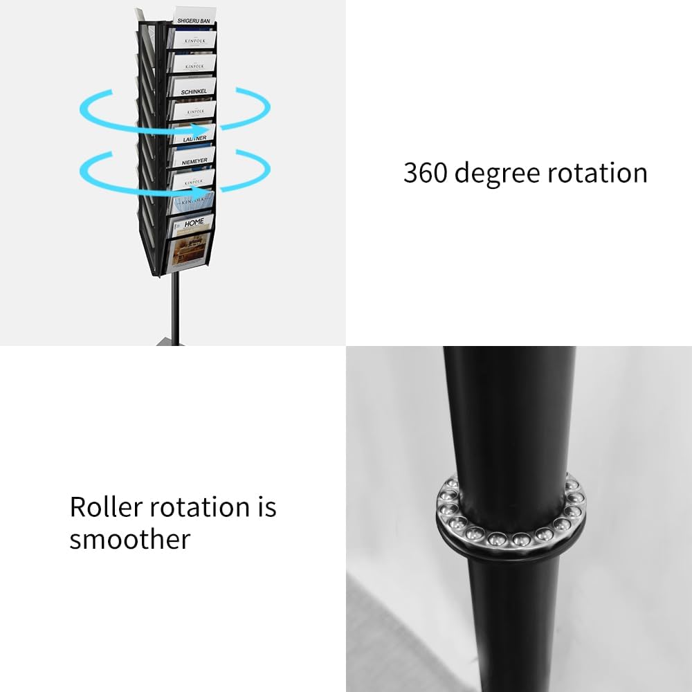 - 360Β°ROTATION:This magazine holder adopts a roller design that can rotate 360 Β°. Thanks to the roller design, the rotation is more effortless and does not cause any wear to the magazine rack. It can meet the needs of visitors from three sides to read magazines at the same time
