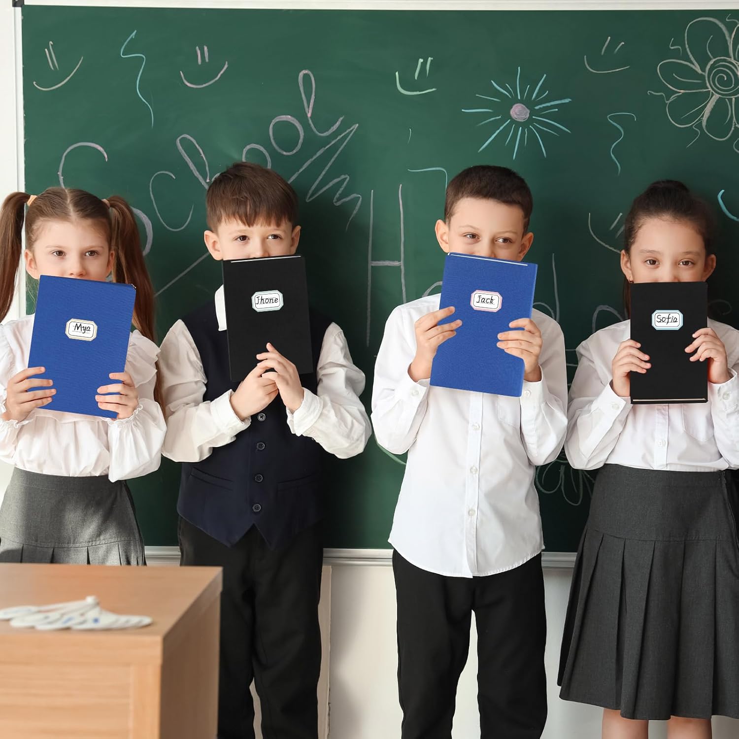 - Book cover kit: This pack comes with 12pcs black and blue stretchable book covers (6 black, 6 blue), along with 2 sheets of name tag labels. These jumbo book covers fit books measuring 9 x 11 inches and can stretch up to 10 x 12.5 inches.