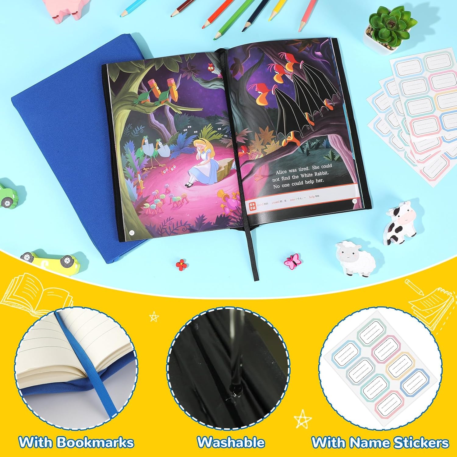- Easy to use: The stretchable design of these blue hardcover book covers makes them incredibly easy to put on. No measurements, taping, or cutting required. Simply slide the stretchy book covers onto the book, and it will snugly fit in place. Each protective textbook cover comes with a name sticker, you can stick it on the cover and write your name to distinguish it.
