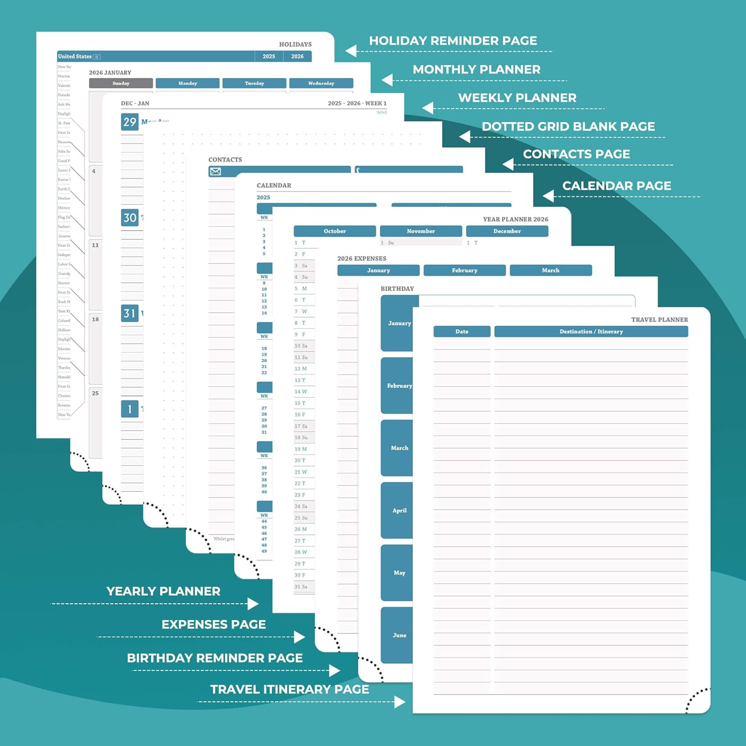 - Universal Design Planner: Suitable for a variety of people and scenarios. Professionals manage project progress, meeting arrangements and goals; student planner 2026 courses, exams and extracurricular activities; home users arrange travel, activitie