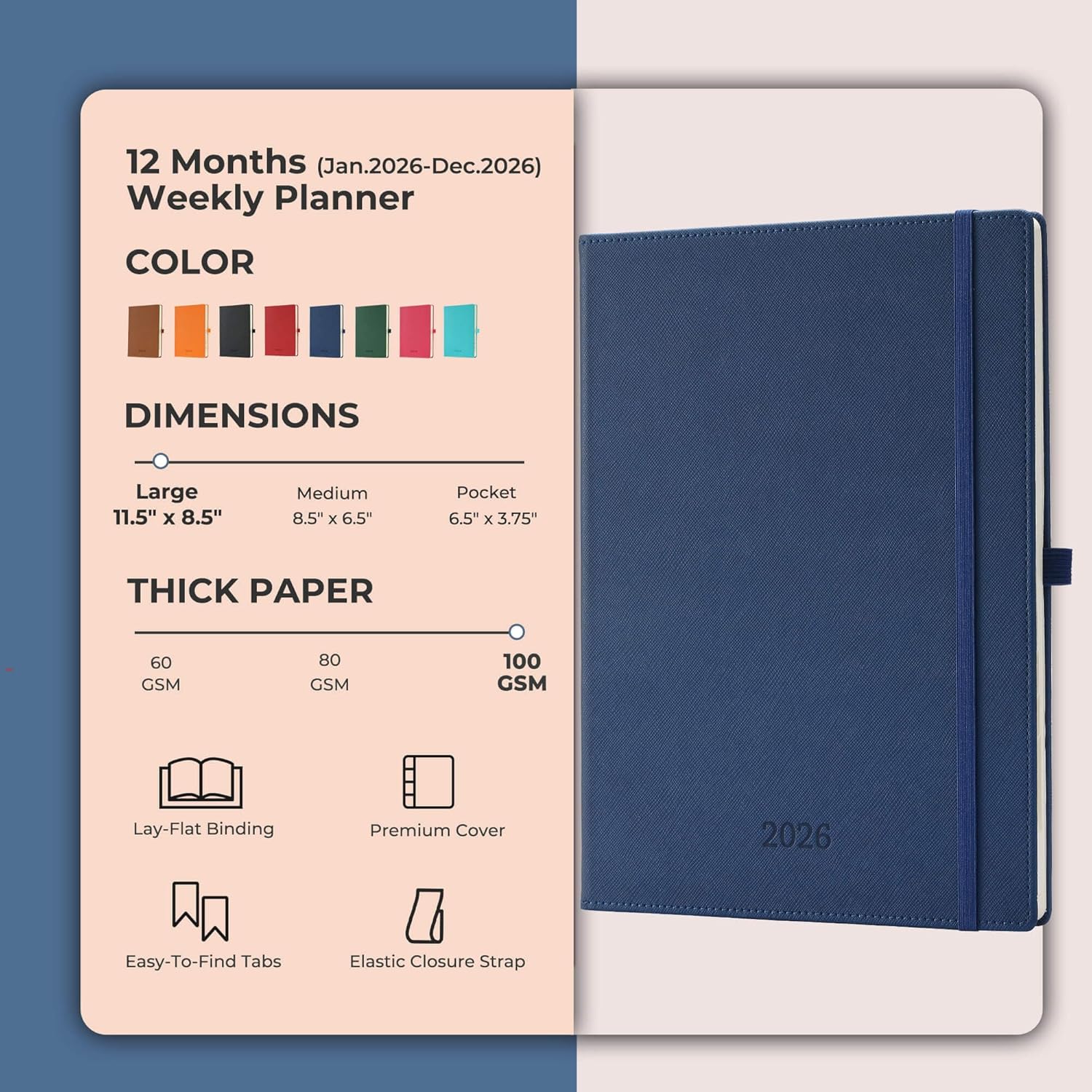 Weekly Monthly 2026 Planner (Jan.26-Dec.26),11.5"x8.5",12 Months Agenda Plan with Month Tabs & Pocket,Expenses/Note Pages, Appointment Book Calendar with Hardcover Vegan Leather Cover,Blue