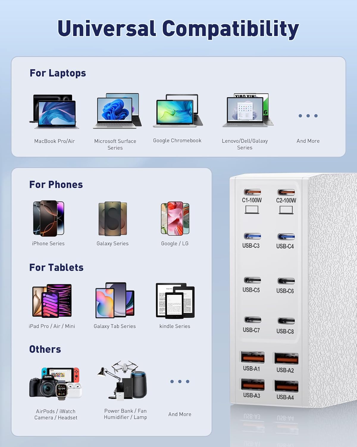 - γUniversal CompatibilityγOur USB C charging station is equipped with 2*100W and 2*65W fast charging ports, which can charge 3 or more laptops at the same time. Compatible with smartphones, tablets and laptops, suitable for MacBook Pro/Air, Dell XPS, iPad Pro, iPhone 16/16 Pro Max, iPhone 15 Pro Max, iPhone 14/13 Pro/12 Pro Max, iWatch, AirPods, Surface Pro, Galaxy S24 Ultra, Switch, Steam Deck, Google Pixel and many other devices.